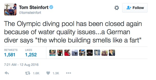Seems like the pool drank the water and got the runs. "I could barely open my eyes for the final quarter," said U.S. competitor Tony Azevedo, after defeating France on Wednesday. "This is the Olympic Games and they are putting so much chlorine in the water that people can’t see. You can’t have that." "Chemistry is not an exact science, something you can easily see" - Mario Andrada, Olympic spokesman