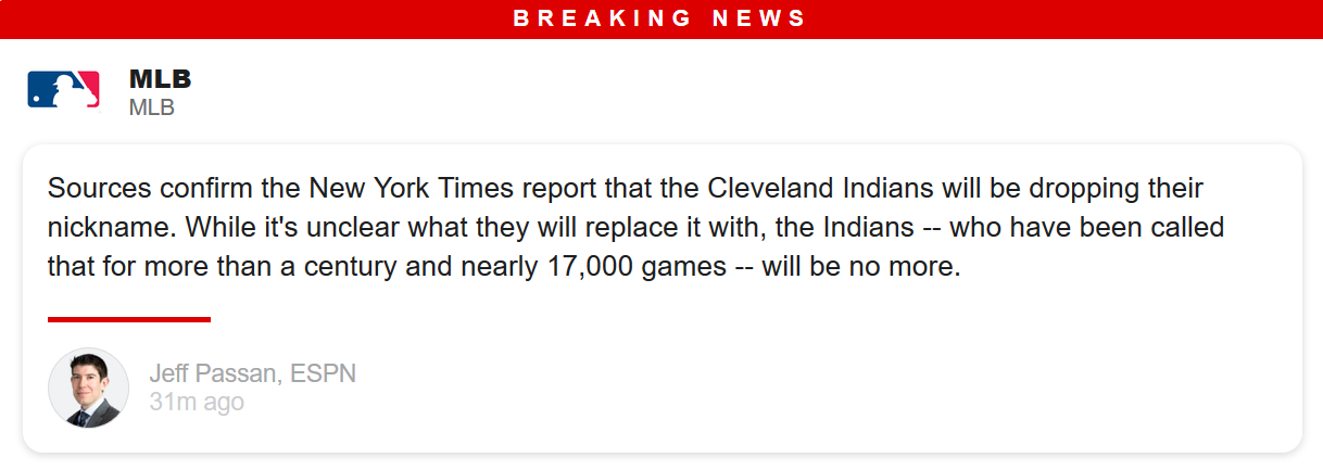 “Braves” is probably the least insulting AND coolest of all the native names. That and the Blackhawks, who may have the best jersey and emblem in sports.