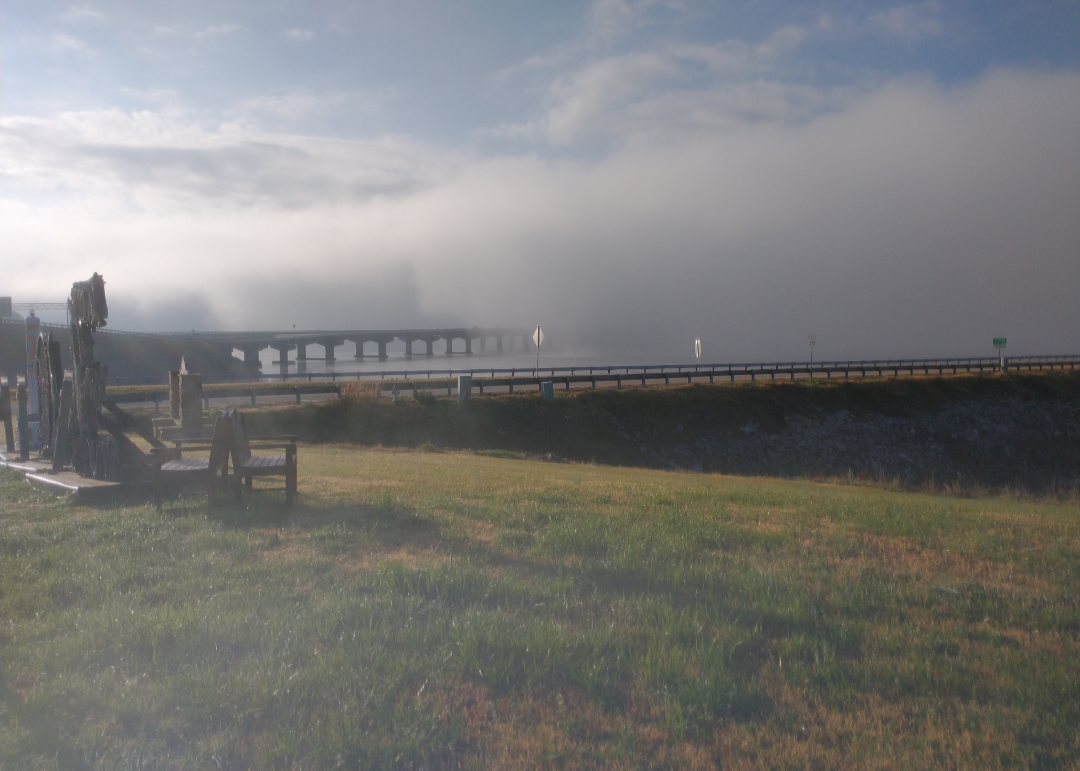 It's actually a really cool lake effect fog that happens when conditions are just right. It follows the old river bed, the cooler, deeper water. the southern shore is just as clear as the northern shore shown in the pic.
