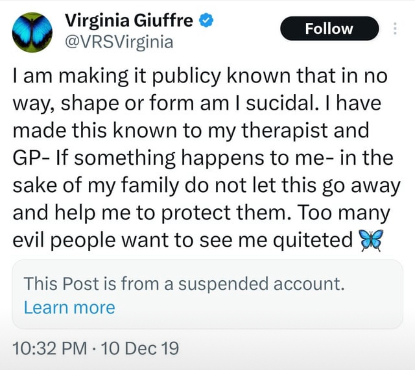 Virginia Guiffre, the most public victim in the Jeffrey Epstein case, by suicide.