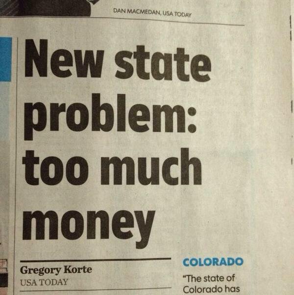 Colorado has weird laws. If the pot tax brings in more revenue than was projected when the bill was written and signed, the state can't decide to keep it, it must go to the ballot. People out here now have to decide if we want individual checks from the extra tax revenue or if we'll let the state hold onto it. Personally I'm content to let the state keep it, it wouldn't be that much per person anyway. But yea, its not an issue of too much money, its an issue of a weird state law coming into play