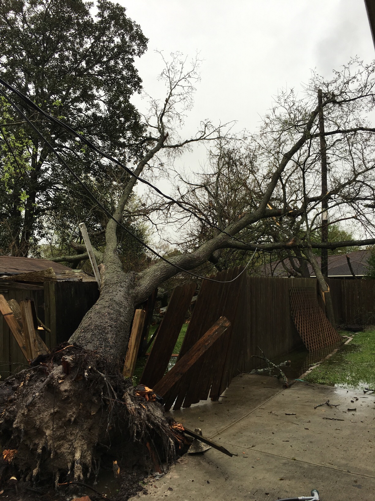 It could be haunted. The house was built in 1957 so none of the homes in the neighborhood have underground lines. Happened around 330am. I still don't get how a tree just falls over while staying totally intact.