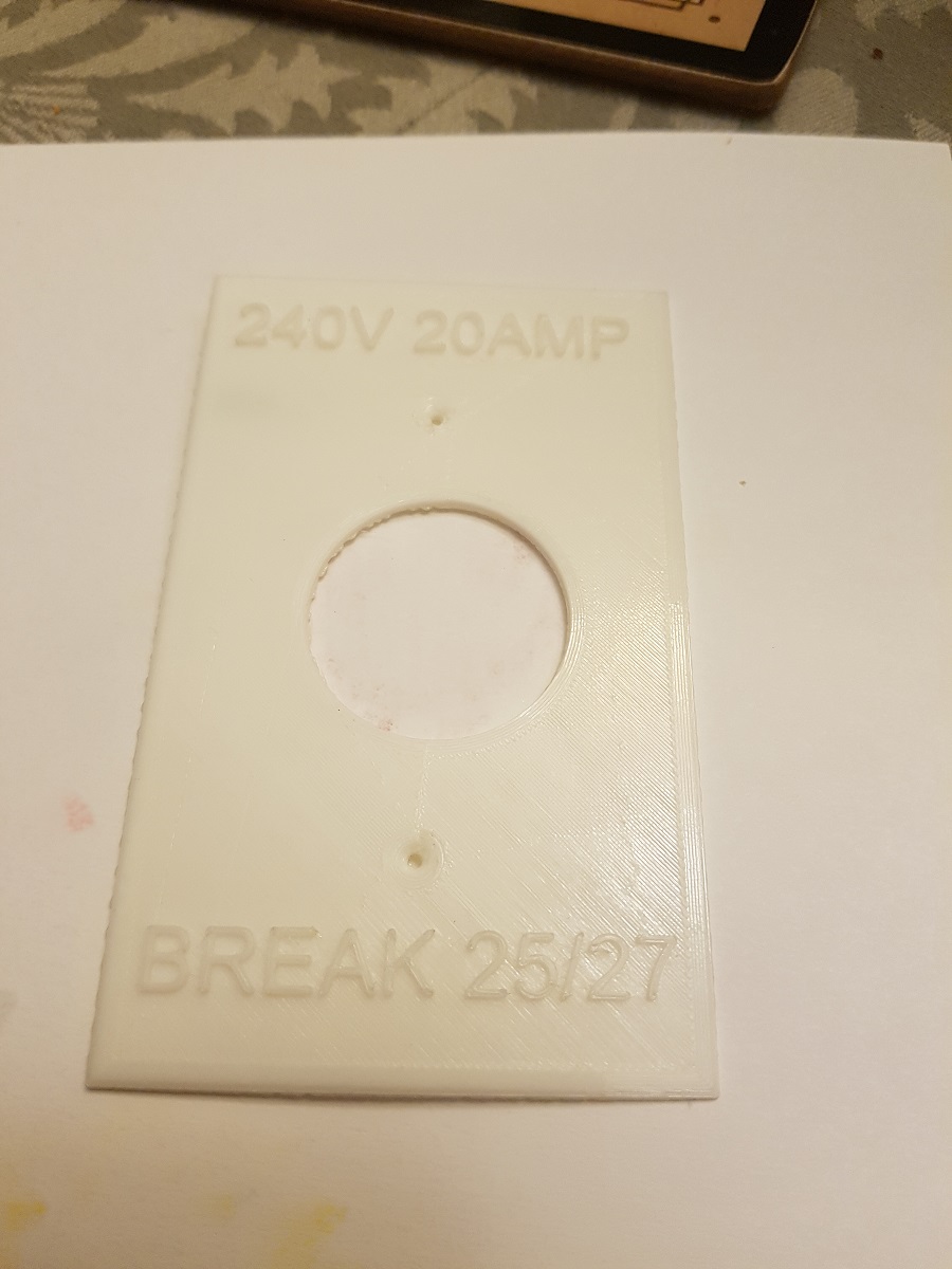 This is my first prototype. It is hard to see in the picture but in your hand it is very visible. I am trying to make my own cover plates for my shop to show what voltage/amp but mostly what breaker it is. For some reason my main centre hole is not in the middle, i am going to have to go back to my model and see why.