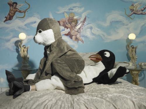 What's weird about a seal (or earless koala bear?) and penguin fucking reverse cowgirl? Or, did you mean the cupid mural?