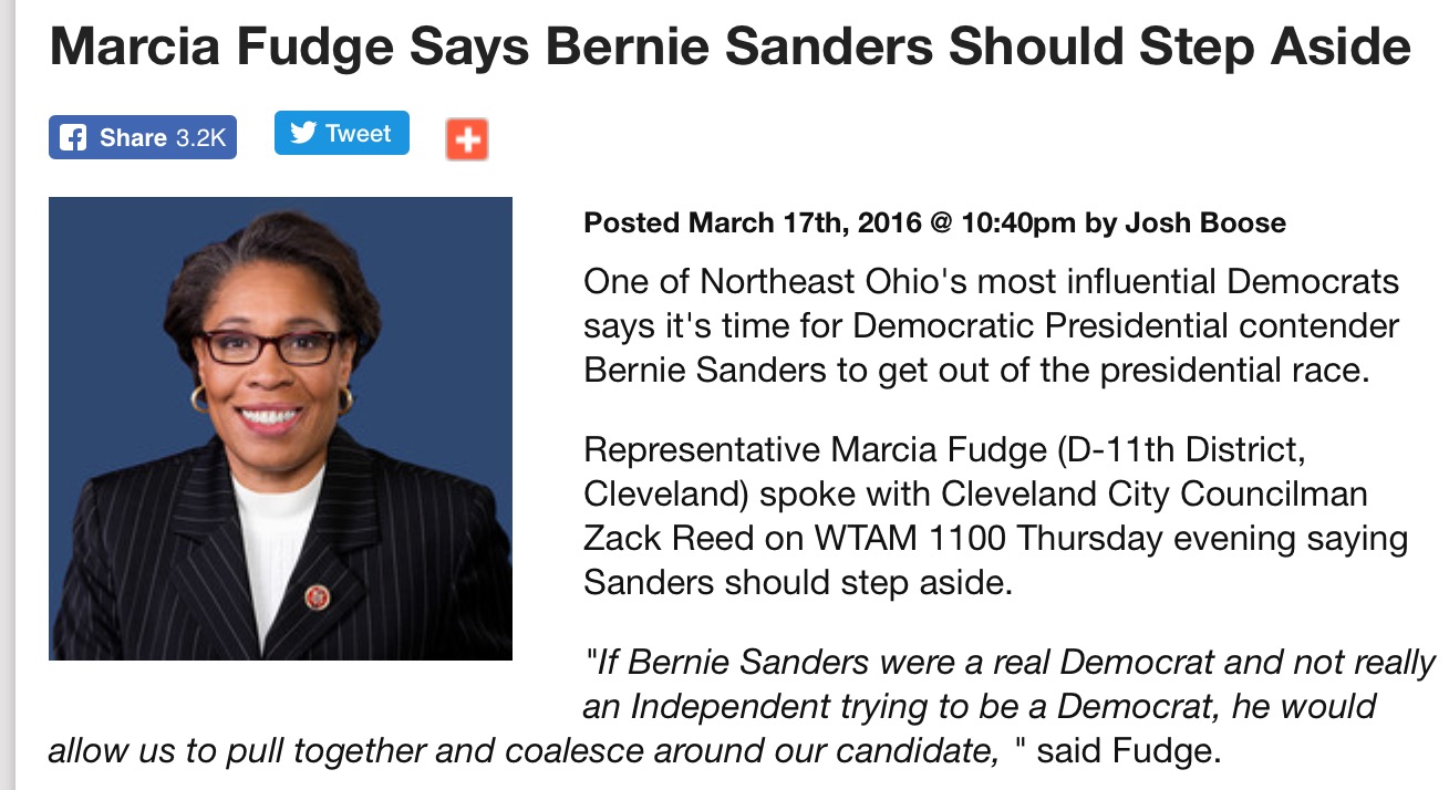 Just wow. It's like they're actively trying to alienate Bernie supporters now. A very interesting campaign strategy to be sure. Meet Marcia Fudge: http://wtam.iheart.com/articles/local-news-122520/marcia-fudge-says-bernie-sanders-should-14506141/