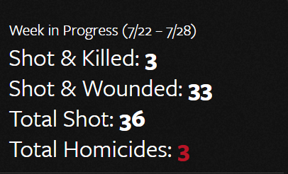Remember a few weeks ago in Chicago when protesters shut down an interstate and the Superintendent of the CPD was photographed marching arm in arm with the leaders of the protest on the interstate? Do you know what happens when you fail to address bad behavior? You get more of it. Protesters plan to shut down Lake Shore Drive in the middle of rush hour on August 2nd and march to Wrigley Field where a Cubs game is supposed to be starting at 7PM. This could get interesting. Meanwhile, we're 2 days into this week and here's this weeks tally so far: