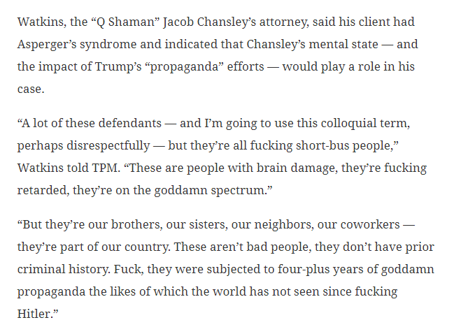 In tonight's news, white people who attempted to overthrow the government find that "stupid" isn't a viable legal defense, nor can they claim to be a victim of "propaganda" from a former US President, and that the government is part of the legal system that doesn't exactly favor the insane, stupid or guilty. Also in tonight's news: "water, just how wet can it get?" This "defense" falls under the tactic of "blame EVERYTHING on Trump, because they won't prosecute him for anything". Watch everyone in hot water from Giuliani to Gates to Gaetz use the same tactic between now and 2024, or until Trump gets convicted of and punished for literally anything. Also, to DCC's point, the DA could not release the footage because it makes finding jurors easier? In any case, I doubt NC will be wracked with protests the way Missouri or Maryland was.