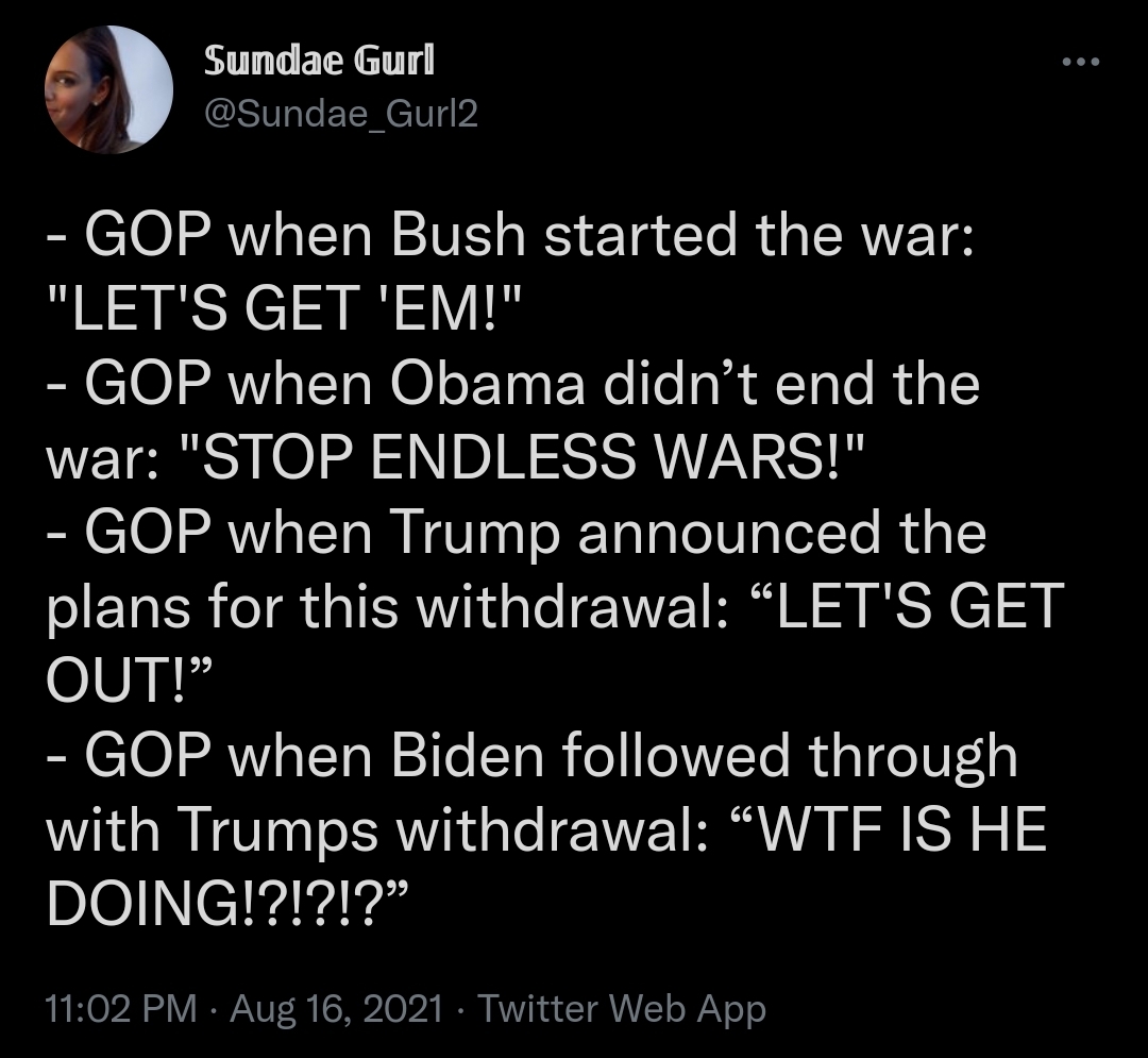 That's what I don't get about all of the armchair quarterbacking over this. The withdraw would have gone smoothly if the ANAL (Afghan National Army LOSERS now) did anything other than run away and piss themselves. But they did exactly that, so what options did we have? Get the fuck out asap basically. Which is what you're seeing.