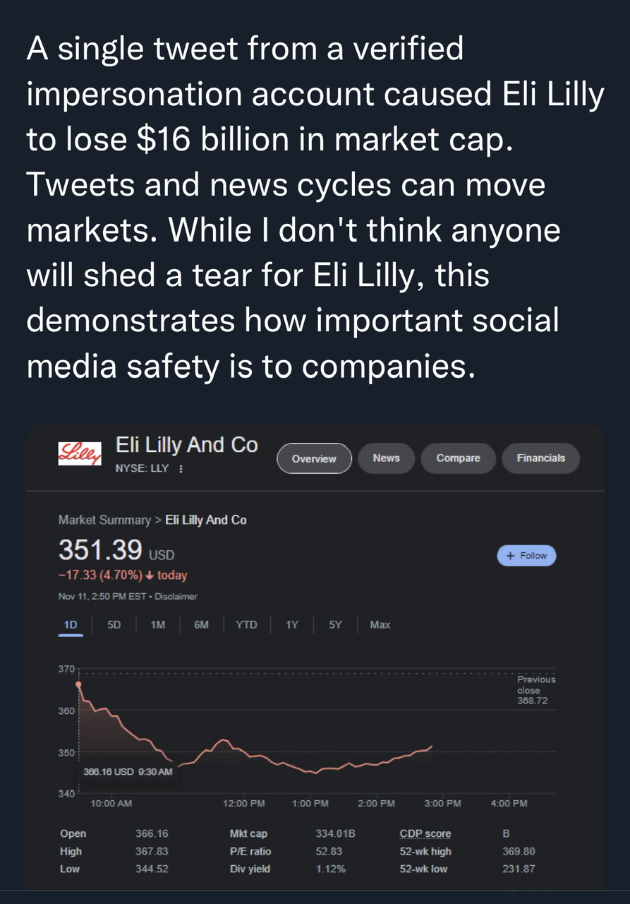 Absolutely. Eli Lilly is a $335 billion company, founded in 1876. I'd add that if their Board let them get their value so tied to something a Tweet could crumble, it wasn't value anyway.
