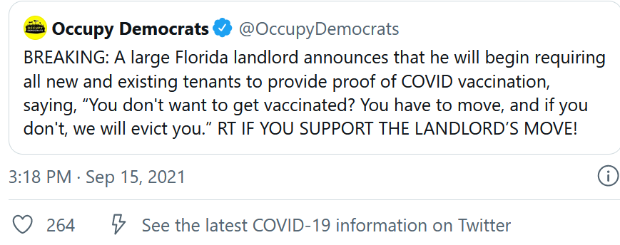 Some landlords here are doing the same. Some of these buildings are very communal and public... public elevators, etc. I don't blame them for forcing vaccinations. Again, if they want to be free to go without vaccinations without a legit reason, they're free to go find another place to live. I'm 100% OK with that. Welcome to the legit, legal consequences of your actions (or lack of, in the case of not getting vaccinated).