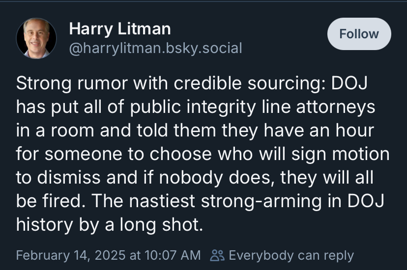 I hope this breaks some people’s complacency - I know I usually come here to get legal things explained to me, but this is so obvious on its face. I mean…is there any confusion as to why the Trump DOJ would decide not to prosecute the Democrat mayor of New York on charges of being bribed by a foreign agent?