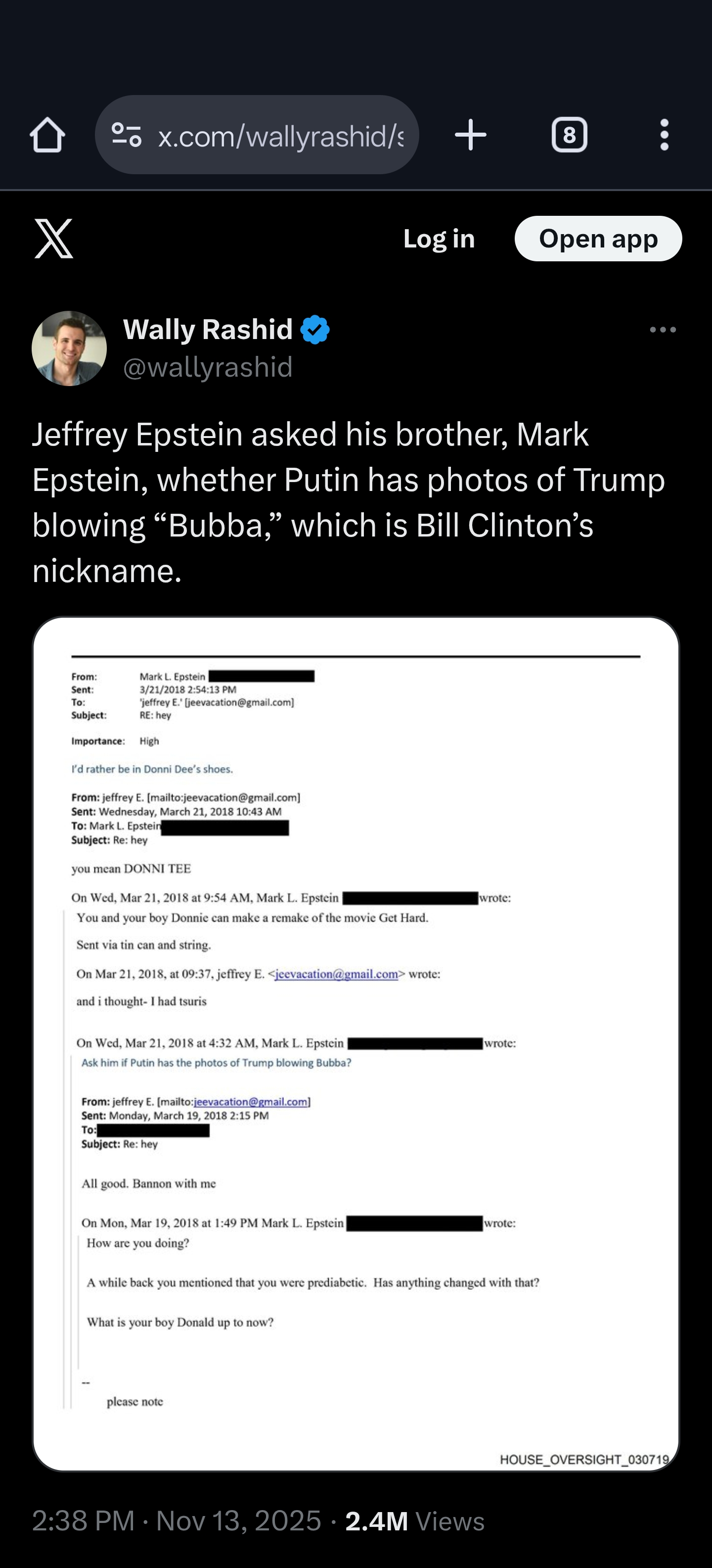 The other rumor going around is that "Bubba" is the name of Ghislane Maxwell's horse. I am morbidly curious about which scenario would be more damaging to Trump.