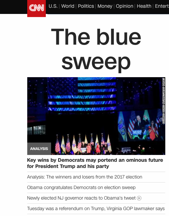 They're overstating the impact of these particular gubernatorial seats, but there are several things about this election that are very good signs for the Democrats going into 2018: Northam won +9 in a race that Republicans were considering winnable as late as election day. That outperforms Hillary's+5 in Virginia in 2016. Democratic vote share is up across the board from 2016, even in red districts Voter turnout in blue strongholds is way up. Democratic voters appear to have learned their lesson from 2016. Democrats captured 14 seats in the Virginia House of Delegates, with five more races too close to call. If they pick up 3 of those 5, they will have unexpectedly taken the majority. Is this the end of Trump? Of course not. But Democrats got exactly what they needed out of this election to head into 2018 on a strong footing.