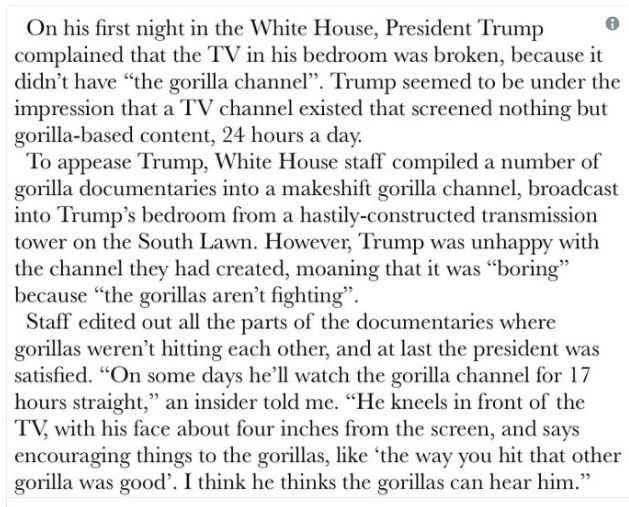 I think it’s more of an indictment on the Trump administration that the fake passage was actually believable to some people. Think about if someone wrote that about Obama or Hillary. People would automatically assume it was an Onion piece. Between the 12 diet cokes a day and all the fast food, and the shear amount of TV he supposedly watches, is it really that fucking far fetched if he might like watching gorillas fight?