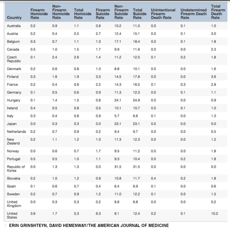 Twice about six years ago. It was basically a throwaway comment in response to the pressure cookers and suicide vets. You're not going to get an argument from me that much of the debate is focused on the wrong things. The majority of gun deaths are from handguns and not mass casualty events using AR style rifles (ignore the word choice, you know what I'm referring to). Those are just the ones that make headlines. Take a look at the chart below and tell me it's not something that is worth looking into. These stats are from 2010 but the general trend is similar. The US has a much higher firearm death rate than any other country. Can we agree that's a problem worth examining? If not then there is no point in even having a discussion. So since every recommendation that comes from a "non gun" person gets shot down, what are we missing? What's the better idea? Accidentally clipped the top of the chart. These are death rates per 100,000 people.