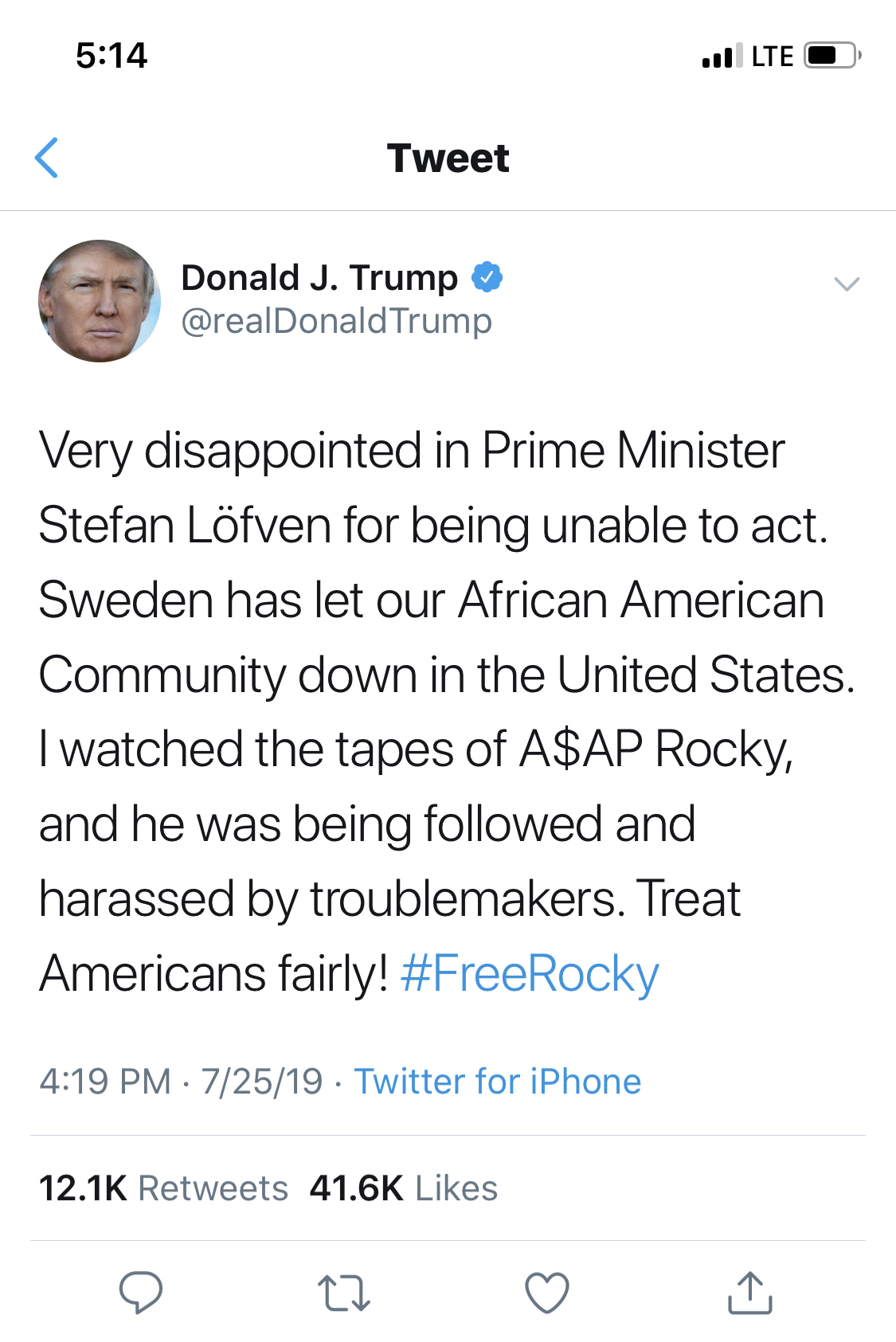 Aside from the fact that he accused the county of Sweden of letting down African AMERICANS, the substance of the tweet is crazy. This has to be a distraction or something.