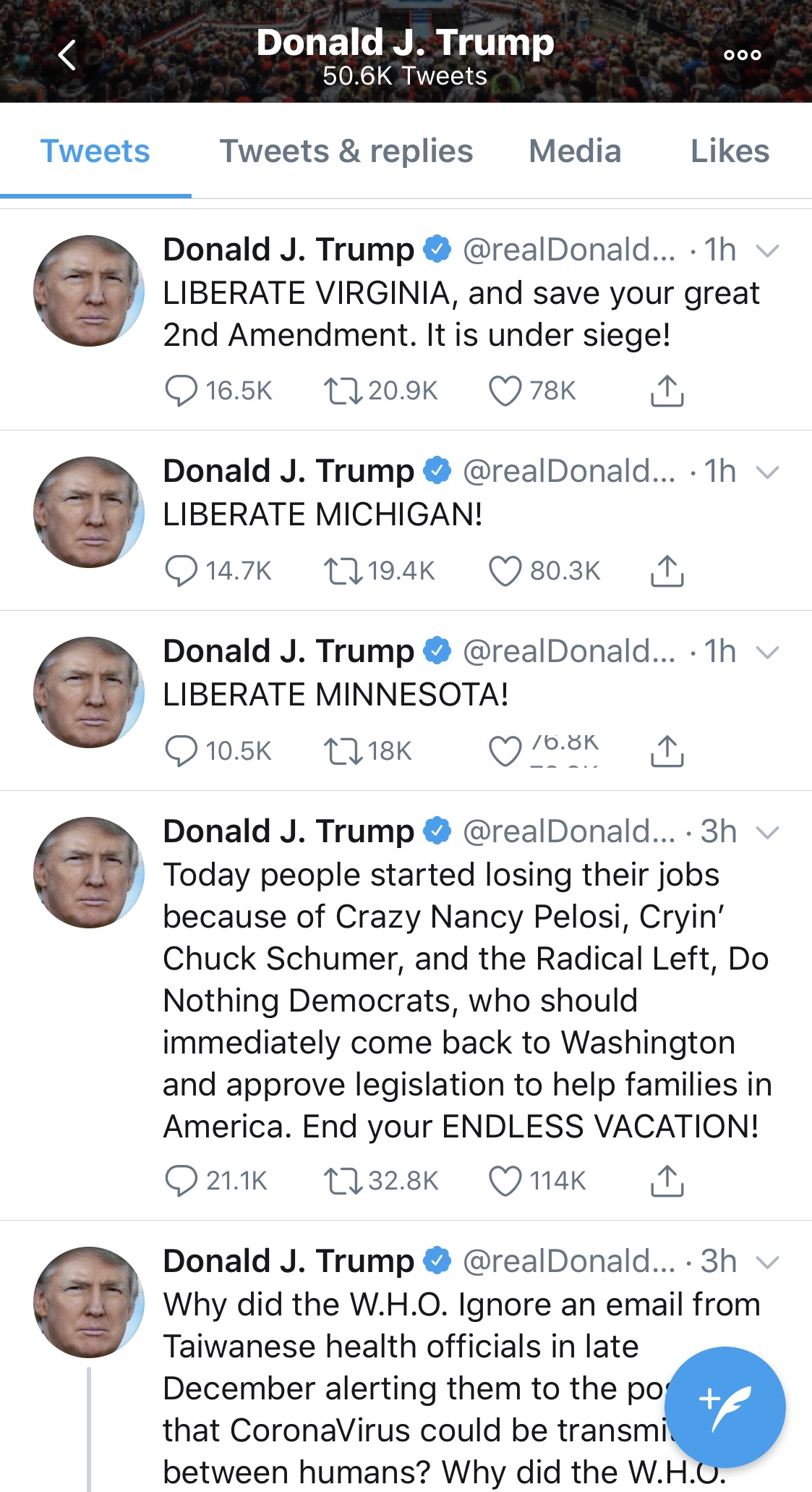 He's lied about testing, ventilators, the nature of the virus, anything else you can think of, yet all of the failure is on the state governors and Nancy Pelosi. This situation shouldn't be politically driven considering we have lost over 30k people in under 2 months and unemployment is through the roof. And if anything else were killing people at the rate that this is killing people, more would be done about that.
