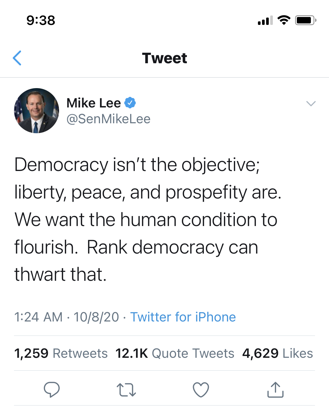 We are nowhere close to a direct democracy, nor is anyone advocating that we become one, and the anger at the Electoral College and Senate is because they make us an unrepresentative republic. The United States has set up, or advised in the creation of, democratic systems of government from Germany to Japan to former Soviet states, to Iraq and elsewhere, and we've never pushed for an electoral college for any of them, because even we know it's a god awful idea that didn't work. Hell, most of these countries don't even have a Presidential system at all, but rather a Parliamentary one. Also, no sane country has given their upper chamber the kind of power the US does. In Germany the Bundesrat is far less powerful than the Bundestag; they certainly don't have the power to completely stack the courts the way the US Senate has done. In any event, Mike Lee is an idiot, and the whole "We're not a democracy, we're a republic" thing is only ever said by idiots.