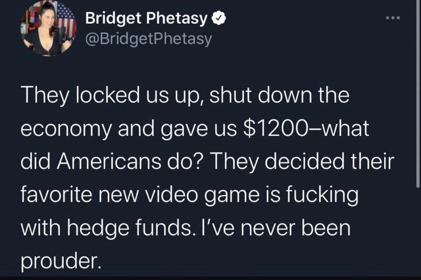 Oh please, fuck her defense. She’s an attention-whoring cunt who’s more concerned about her social media rep than anything. I don’t really give a shit about Ted Cruz, but it looks like his wife is an MD of a wealth management practice. That’s a long way from running a hedge fund taking over-leveraged short positions. Solidarity on the issue could have been a great thing to wield when trying to protect retail traders from what is clearly an attack on them. But of course, it was quickly squandered.