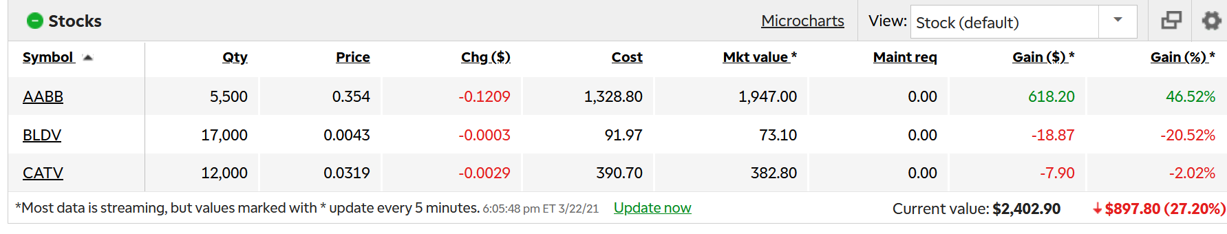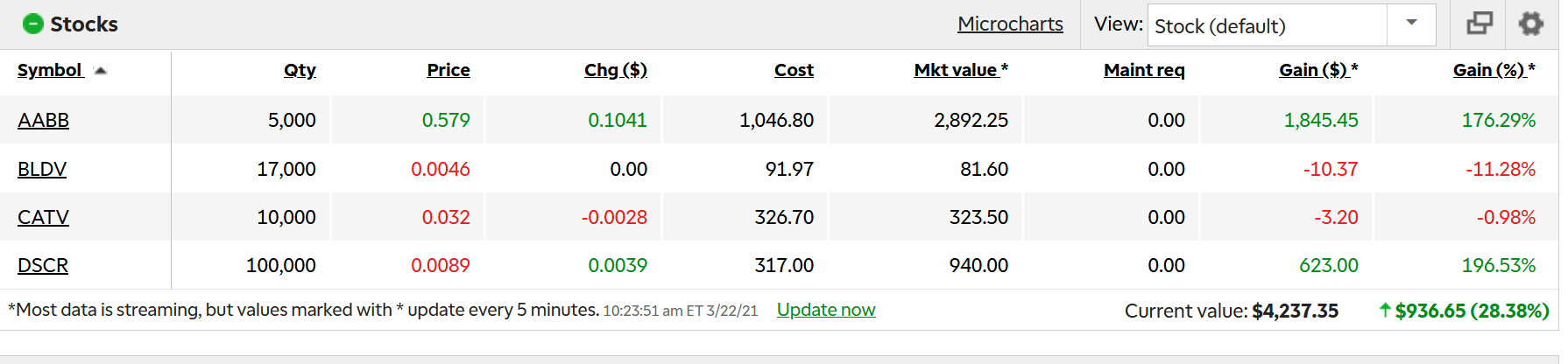 I sold 10K shares to fund the DSCR stock and when I sold the DSCR I bought back 2K shares with what was left from my taking $500 back into my bank account and buying 500 AABB. I'll probably leverage myself to 100K shares at some point. I like the stock and think it's undervalued, it just needs a couple of catalysts to happen. Number one, change the name. They're using an old ticker and it comes up as 4CableTV and they're a cannabis company, and number two, waiting on their financials. They appear to be a solid company, the CEO has a winning track record, and they're making acquisitions. In an already crowded field they appear to be making all the right moves. I don't foresee a meteoric rise like some stocks, but I think they will go higher. I certainly don't see losing money on it holding long.