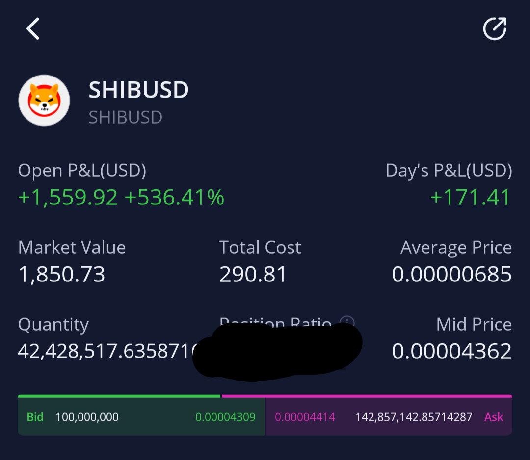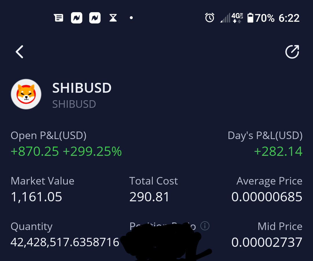 Shib is still red hot. Broke out of a massive bull pennant that has been filling in for a couple weeks. Briefly put me above 400% overall gains, It's settled down to about 387% right now.