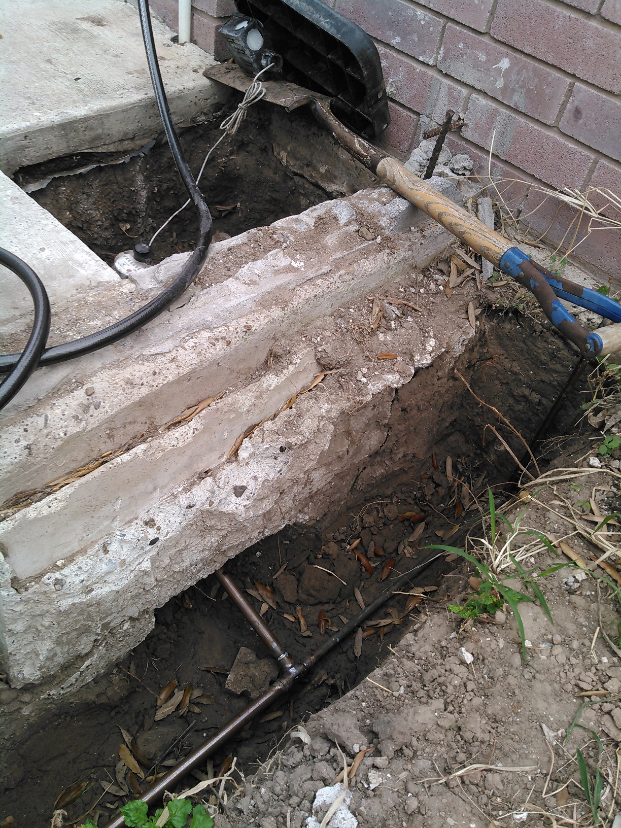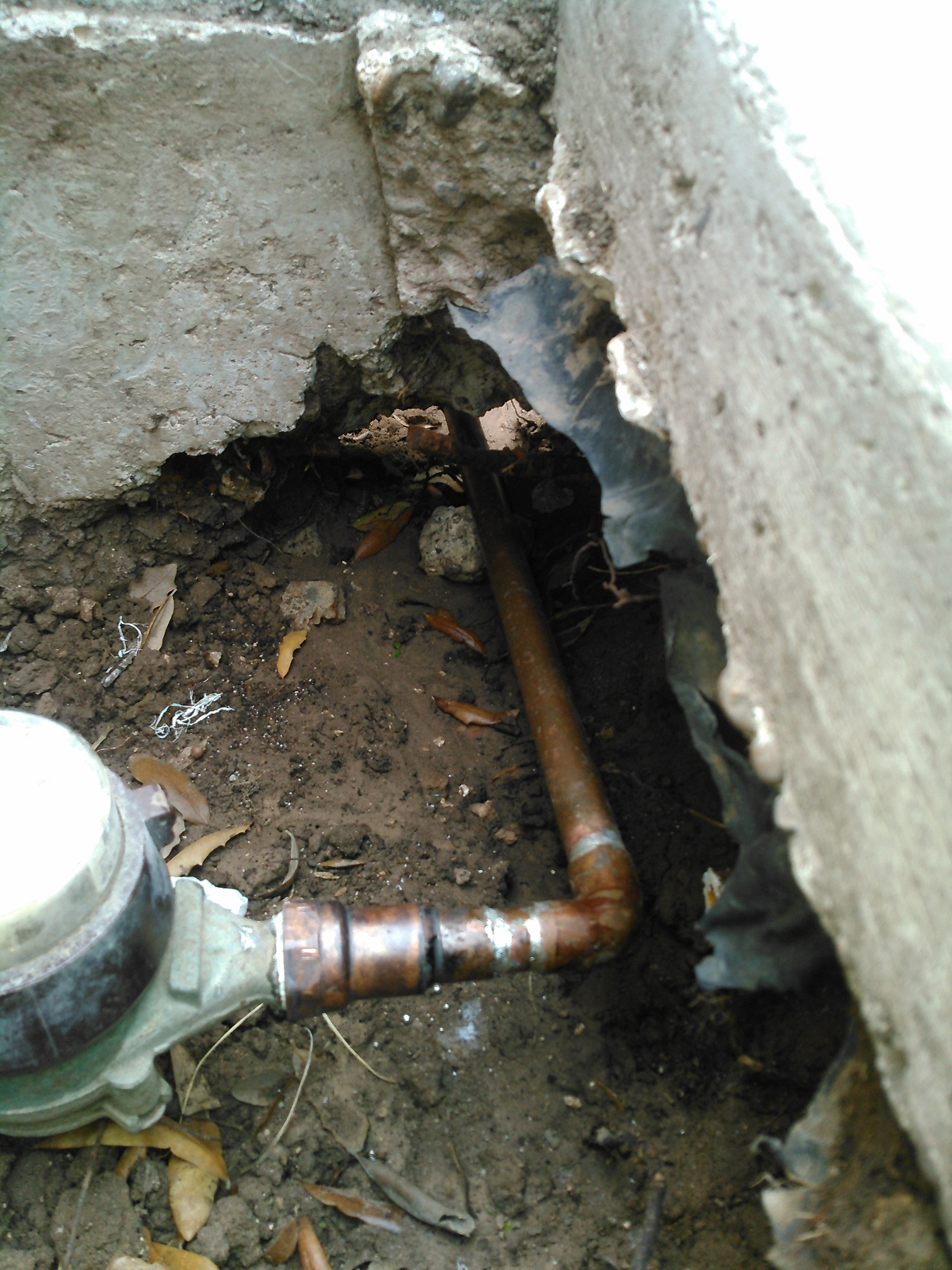 Now onto the other side of the house, where things start getting hairy. This is the trench at the back of the house. You can see one of the extra faucets added, and if you look really closely behind the big sewer vent pipe, you'll see the propane line. I spent about an hour carefully digging out that section with a hand trowel. Spoiler I'd say this was the hardest part of the job: Cutting through the foundation to hook the new pipes up to the house water lines. I bought a diamond grinding wheel to cut through ten feet of concrete. I borrowed a friend's portable air compressor and air-chisel to break it all up, I'd like to have gone a couple of inches deeper, but that was some hard-ass-fucking concrete, and it took me about six hours to get this done. Here's how the beginning looks; that smaller pipe to the left is for another added-on faucet: Spoiler Here's the second half, with the new 90-degree COCK VALVE soldered in. In case you're wondering about that little capped-off stub, that's for a toilet that is just out of frame; I'll hook it up later. Spoiler After I got everything soldered together, I had to test it out before hooking it up to the water meter; otherwise, I might have had to do with NO WATER for a day or so. I I pieced together some PVC fittings and some 3/4" heater hose, pressurized it, AND NO FUCKING LEAKS. I'm pretty proud of this; I grew up watching my dad do all of his own plumbing (he was a PVC man to the end, though), and I hope he would be proud of me. Spoiler