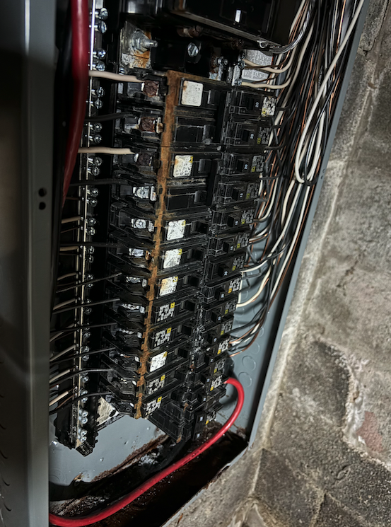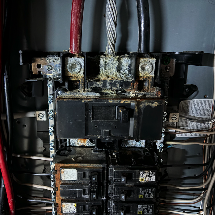 Holy fuck, this just went from bad to worse. Electrician was here and knew right away where the problem was and located it. The weather head where the power meets the house is broken. So all these years, water is running down that, through the meter, and down into the breaker box. All of that has to be torn out and replaced. In addition, they have to relocate the meter to another part of the house because of new construction on that part of the house. The power company won't put a ladder on a roof, which they'd need to here. He told me he's surprised we still have power, and not to touch a thing in the hopes it holds out til it gets replaced. I felt nauseous for a bit, but thankfully the wife has an emergency fund so we can cover the cost. I just poured a really strong drink, and calling our homeowners insurance to see if this is something they'd cover. Can't hurt to ask. Oh, here's what the breaker box looks like: