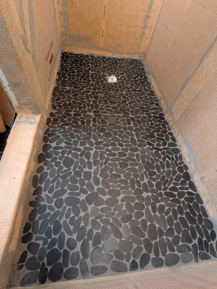 3'x6' Knee pads, and constantly moving between sitting and kneeling. First time doing river rock type tile. Learned a lot. Would definitely do a few things differently. - They said to use a 1/4 trowel, 3/16 would be fine maybe even smaller, would have to test. problem with 1/4 is it leaving to much grout and when you push the rock down it pushes up between the rock and is a pain to clean - The rock comes in sheets of 12"x12" on a membrane that you can move around. I would try to spread it out better so you dont see so many straight lines, as you can see i got better the further to the bottom i got - It takes way more grout then you can imagine. Have lots on hand.