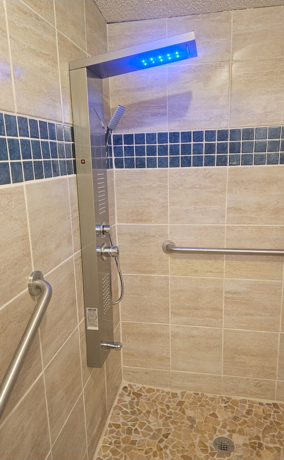 I, too, tried the light up toilet seat. I abandoned it because of cleanliness. It obviously did not help my child aim any better, because the light itself would get pee in it. I don't expect the lights to work very long in that environment, but we'll see. They are just crappy LEDs powered by two AA batteries. When I get rid of the popcorn ceiling eventually, I will probably put a light/fan combo over the shower. The current fan is about directly above where I am standing for that picture. I also hope that panel thing isn't a complete piece of shit. It was cheap enough to make me nervous, and the reviews go both ways, good and bad. I do still have to seal the tile and grout, so I haven't actually turned it on yet.