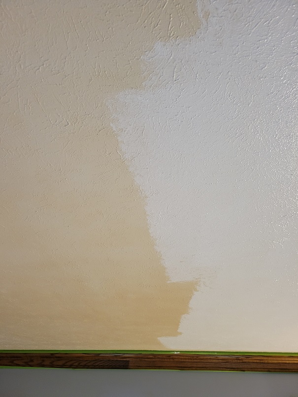 I lived in a house full of smokers, which naturally led to me picking up the habit very young (first started at 15), luckily once I had moved out of my parents and wasn't living in the constant anosmia blindness of how truly bad it was, I was able to give it up. Haven't touched a cigarette in almost 20 years and never will again. After both of my parents passed away and my siblings and I had to sell the aforementioned house, it was a real 'slap some lipstick on a pig' situation. We knew we weren't going to ever be able to fully reverse 40+ years of damage without completely tearing the house down to the studs and basically starting over. That's the next person's problem. However, I did manage to snap one picture of when we were painting over the ceiling that really just shows off the damage they did. And this wasn't even the worst room in the house.