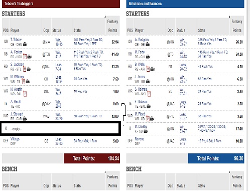 I forgot Sebas was drafted 17th overall in 2000 (the same year Tom Brady was taken at 199th). Anyway, I'd rather lose this week where even had I made the right subs, they still wouldn't have given me enough points to win than where I lost in week 1 by something like 8 yards. Going to try picking up some rando's this week and see if any pay off or at least show some promise. In the meantime, Josh Freeman needs to never give me a week like this again.