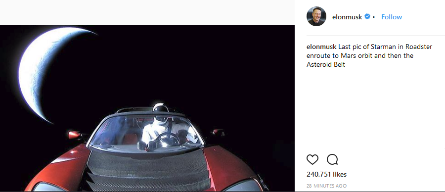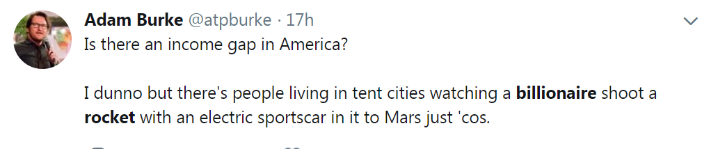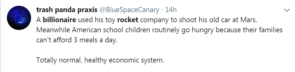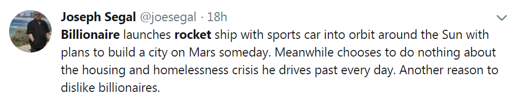 Yup. Especially, if you pay even the smallest amount of attention to what he says about why he's doing what he's doing. First off, he couldn't do any of it if he weren't a billionaire. Second of all, he's made it clear, that all these lofty goals are for the long term betterment of mankind. Not a homeless meal for today, but sustainable life for thousands of years. How long have people been trying to make electric cars that the public didn't scoff at that didn't resemble an Ed Begley, Jr. comedy skit? And, then, he builds a badass roadster that people actually want. Have you tried to excited a middle schooler lately? Try to tell them how cool the original moon landing was. Yawn. Now, show them a fucking roadster cruising through space. Which one will excite them about math and science? To all those fuckers posting that shit on twitter: what did you do today to make earth a better place? And, he doesn't sugar coat or hide anything about the failures. Just right out there and owns them as learning experiences. Fuck off.