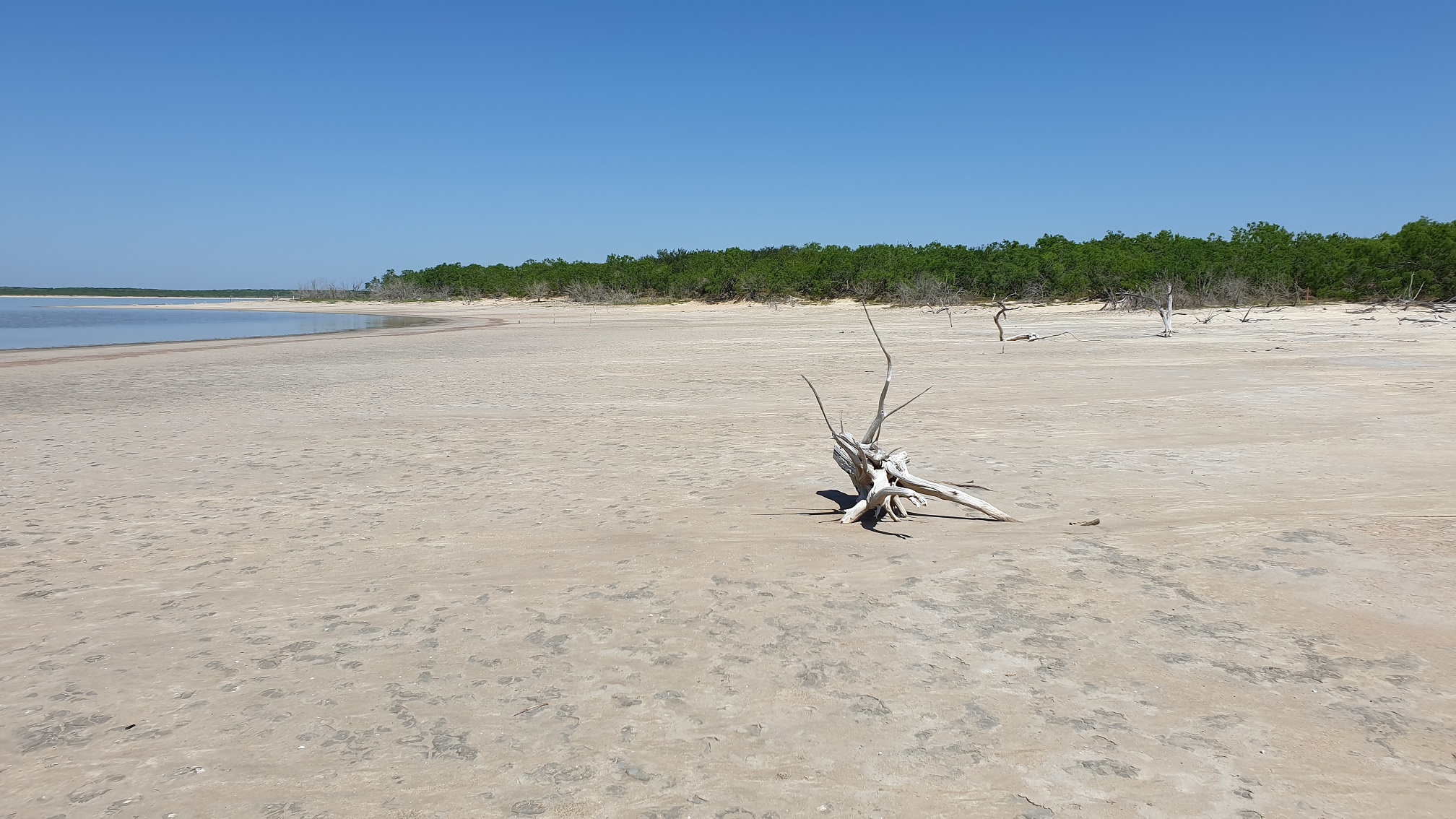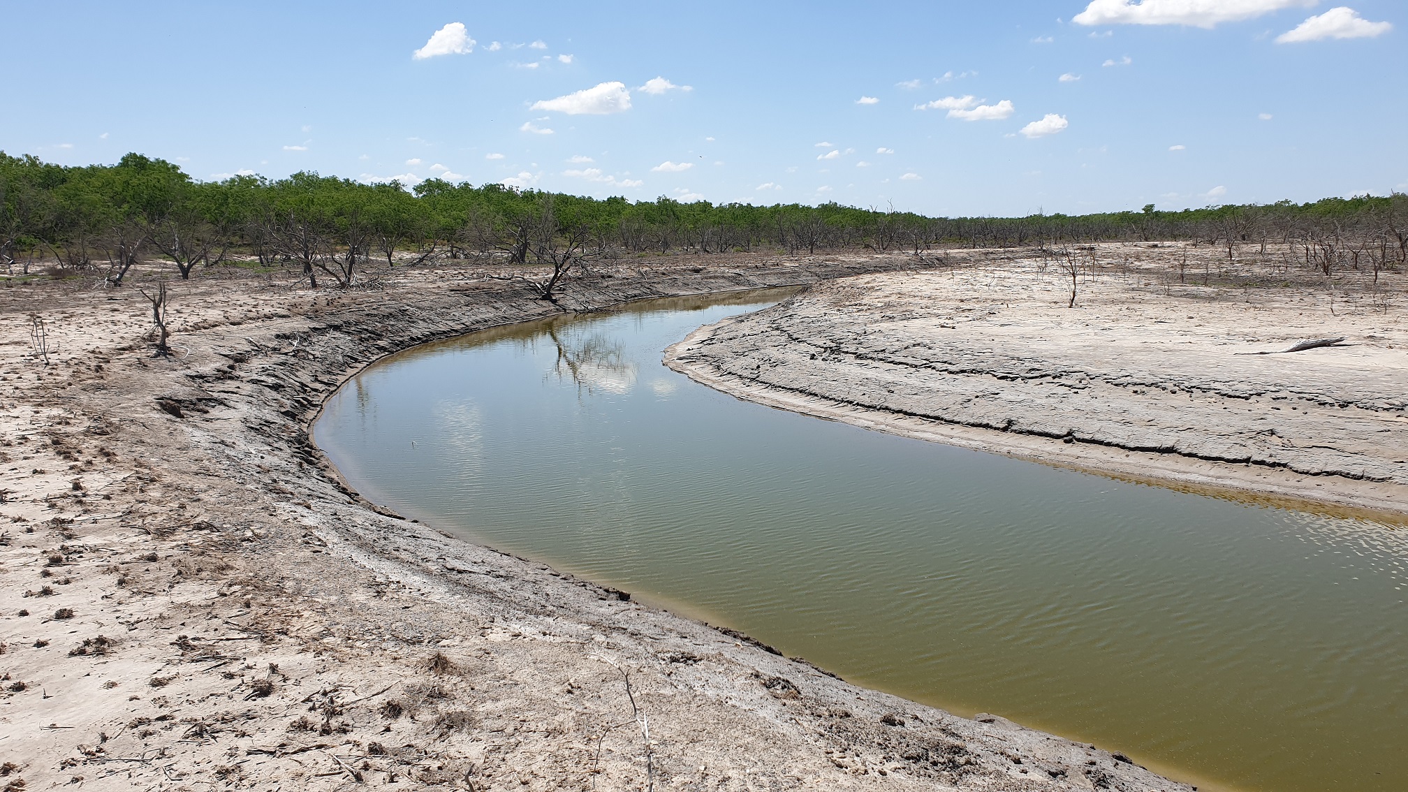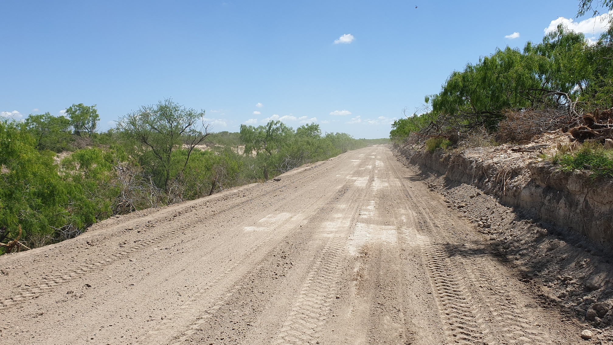 Last week I got a chance to see one of the salt lakes in my area. There are two of them, and they are all on private ranches. One (El Sal Del Rey) is now open to the public, but the other (La Sal Vieja) is still closed off; until now. The organization I work for is doing a project in the area*, and we need access. We are enlarging a natural drainage ditch to tie in with the man-made ditches. I still had to hike almost a mile through South Texas brushland to get to the lake, but I finally got to see it for the first time. I've been trying to find a way to see this place since I was a kid, looking at some of my dad's land-survey maps. Spoiler This is the road going into the lake. Until a few weeks ago, it was completely overgrown with mesquites. All other access roads are private, and locked. Spoiler This is what it will look like when we're done. That bridge is as far as we have permission to go at this point. I had to hike the rest of the way. Spoiler I'm going to show these in the order I took them, so you can get some kind of idea of what it was like seeing this place. Also, I do need to mention that I was on my lunch break when I did this, and had to be back on time. I plan to go back and take more pictures in the future. Anyway, after that bridge I mentioned, it's all mesquite brush, and you have to use the ditch (or space in the trees) to keep your sense of direction. I finally got to a point where the salt overpowered the mesquites, and came to an open area, where you can see the natural drainage channel. Spoiler Here's the same channel, further along the bend. Spoiler And here is a dead buck deer in the water... Somewhere in there. Also, I saw a few live deer along the way. Spoiler You keep going, and you get to this point, where you can see the lake. Spoiler Spoiler I hope to go back and post more pictures, soon. *There's a lot of things I really like about this job.
