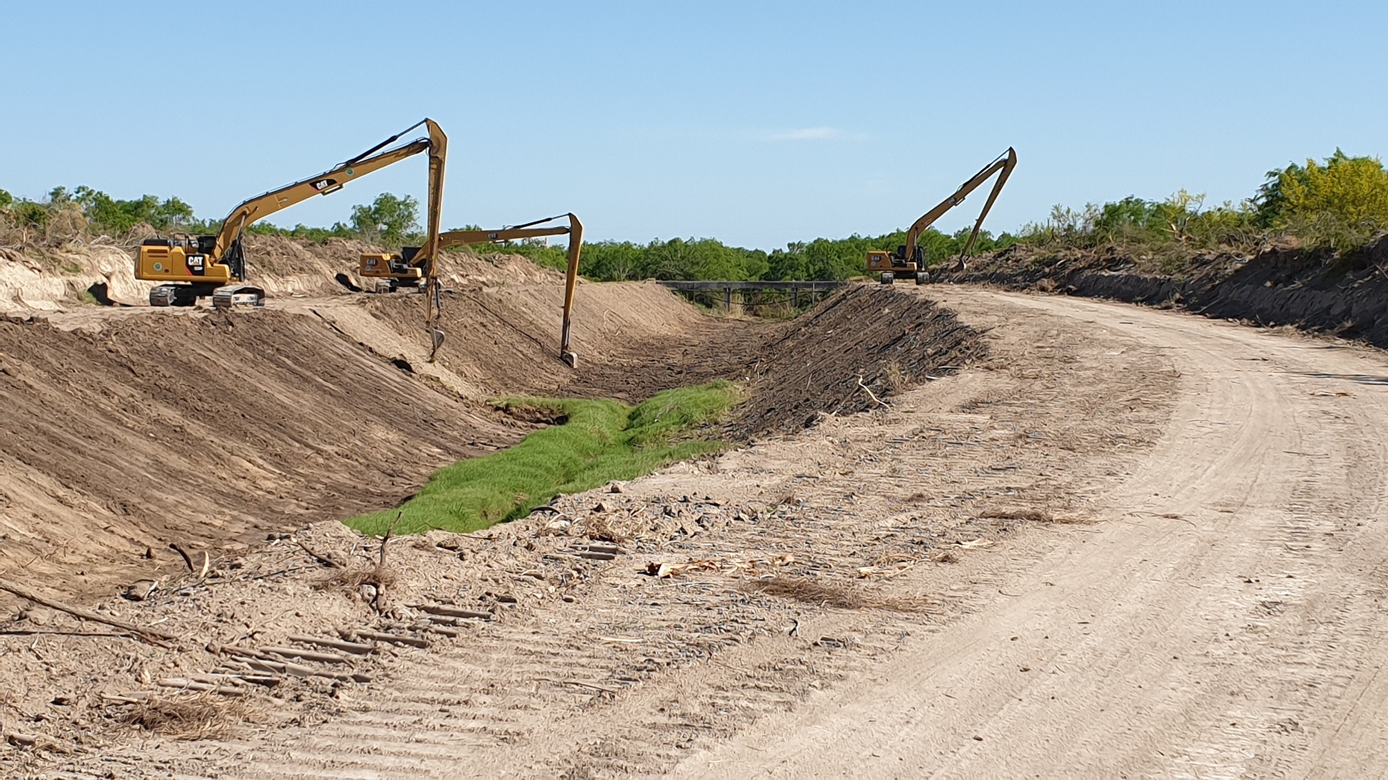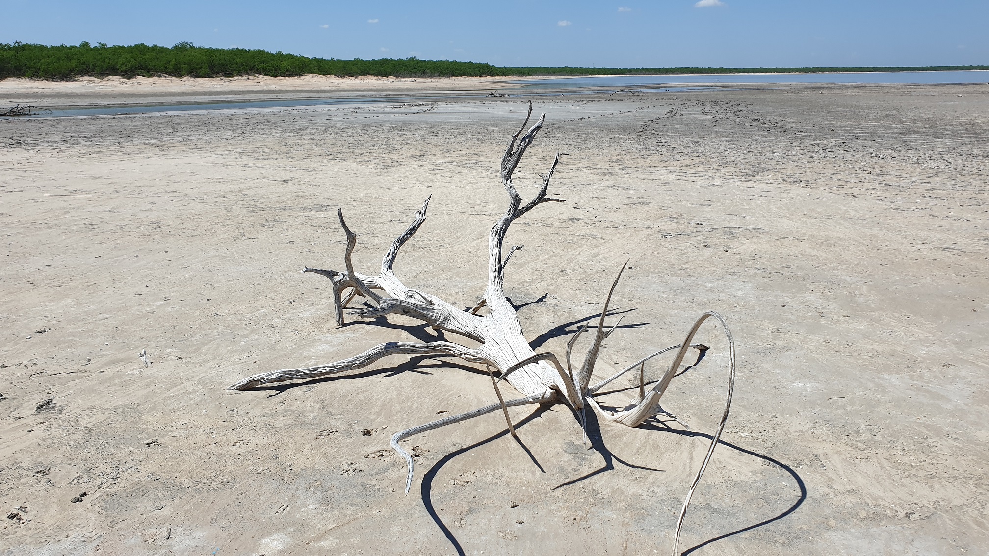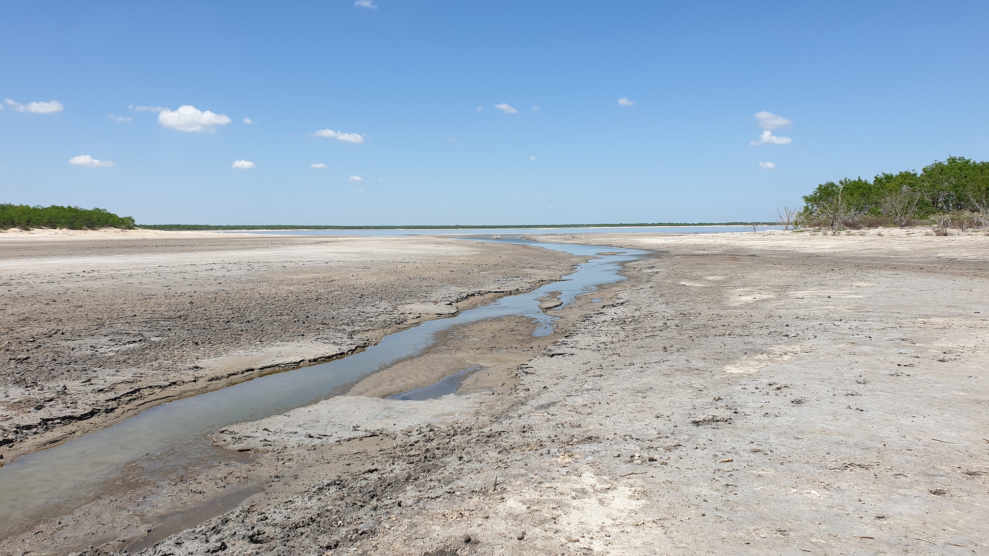Last week I got a chance to see one of the salt lakes in my area. There are two of them, and they are all on private ranches. One (El Sal Del Rey) is now open to the public, but the other (La Sal Vieja) is still closed off; until now. The organization I work for is doing a project in the area*, and we need access. We are enlarging a natural drainage ditch to tie in with the man-made ditches. I still had to hike almost a mile through South Texas brushland to get to the lake, but I finally got to see it for the first time. I've been trying to find a way to see this place since I was a kid, looking at some of my dad's land-survey maps. Spoiler This is the road going into the lake. Until a few weeks ago, it was completely overgrown with mesquites. All other access roads are private, and locked. Spoiler This is what it will look like when we're done. That bridge is as far as we have permission to go at this point. I had to hike the rest of the way. Spoiler I'm going to show these in the order I took them, so you can get some kind of idea of what it was like seeing this place. Also, I do need to mention that I was on my lunch break when I did this, and had to be back on time. I plan to go back and take more pictures in the future. Anyway, after that bridge I mentioned, it's all mesquite brush, and you have to use the ditch (or space in the trees) to keep your sense of direction. I finally got to a point where the salt overpowered the mesquites, and came to an open area, where you can see the natural drainage channel. Spoiler Here's the same channel, further along the bend. Spoiler And here is a dead buck deer in the water... Somewhere in there. Also, I saw a few live deer along the way. Spoiler You keep going, and you get to this point, where you can see the lake. Spoiler Spoiler I hope to go back and post more pictures, soon. *There's a lot of things I really like about this job.