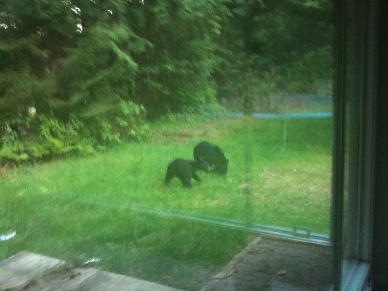 Spring is here... momma and baby bear paid a visit while I was working this afternoon. I never would have noticed, except that the momma bear was trying to force her way into the house through the living room door, and I went to see what the crashing/banging was. Thank God it was locked, for a change. Went running to the bedroom to grab the camera... and the slug gun. Thankfully, only pictures were needed, but that momma bear freaked me out... she was NOT afraid of me, even though I was inside, and in no way endangering her cub. Either she's becoming territorial about food, or she's starving and not giving a shit... both of which are not normal behaviours for black bears, and make them sketchy.