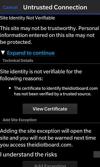 I don't want to hog this thread just for me, but in case there's a learning exercise here, or maybe somebody else needs the info, I'll respond. This is the error: If I "view certificate," as you know, it reads Let's Encrypt Authority X3 www.theidiotboard.com Yes, apparently. And, just to be clear, as you pointed out in your second post, it's the BlackBerry OS (10.3.2.556 in my case), not the specifically the Browser. I tried the native BlackBerry Browser and a couple others, with no luck. (FYI, anyone using a BlackBerry 10 device - haha, I know it's just me - I highly recommend Browsie Browser. When I downloaded it, it was free. I think it's $2.99 now, but it's very good, if you're having trouble with the native one.) I went through that. I have never imported certificates before, so I really didn't know what I was doing. I successfully imported all the .der files (which were actually .cer files). But, then the second user in that forum post wrote . I don't know how to do that part. I downloaded the text on the page you linked from the Let's Encrypt hotlink . . . but, then I didn't know what to do next. Importing certificates only let's me import .cer files, not .txt files. Can I create a .cer file from that text for the DST Root CA X3? Also, in a bit of irony, when I followed the instruction: "On your device. go to https://letsencrypt.org/certificates/" I got the certificate error. So, I used my PC to download them all to my dropbox and imported them that way. What happens if I just add it to the exceptions? If I check the box "I understand the risk" I would be lying, as I don't understand the risk.