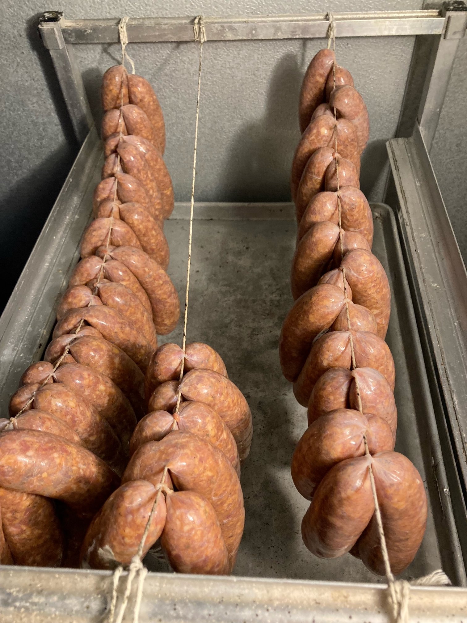 Here's my smoker I get to play with on a daily basis. Here's some of the sausage I stuffed this afternoon. Texas red hots I'll be smoking off on Thursday, so I'll throw some photos up when they are sizzling away. And here's the short ribs about 1/3 of the way finished. I'll get a completed photo tomorrow.