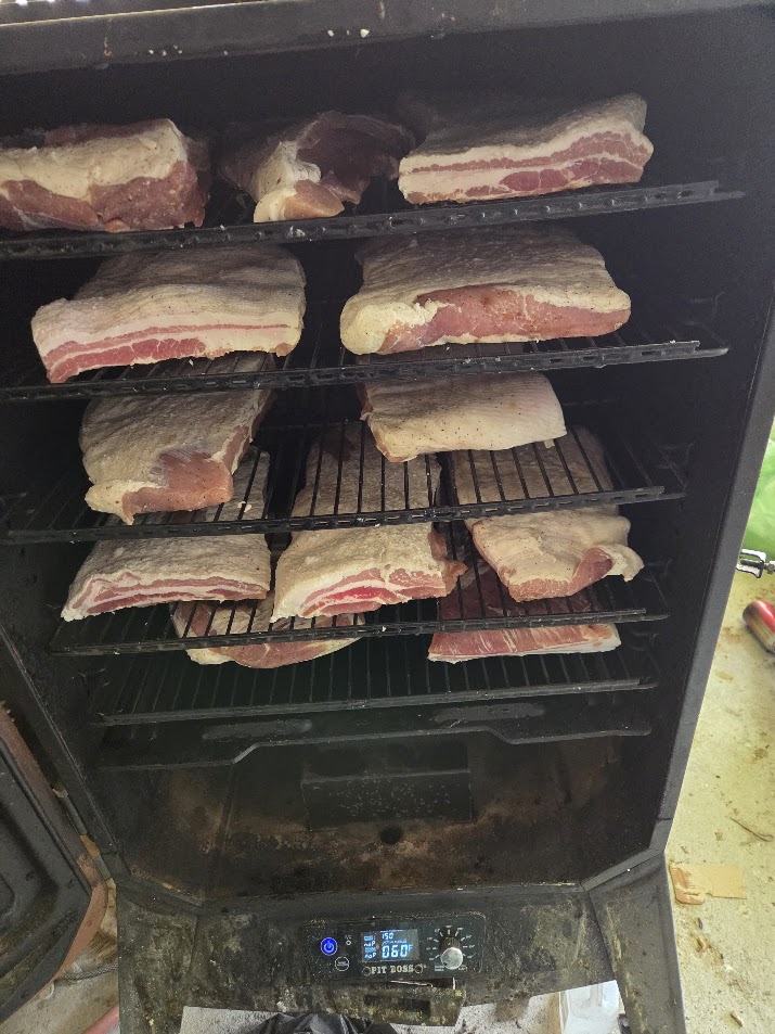 2 weeks of dry bine in the fridge. You only really need a week, but i have a spare fridge in the basement for stuff like this, so the longer the better i guess. 400g salt 200g sugar 60g pink salt 15g garlic 15g pepper 5g pepper flakes is my recipe for the brine. Take 3% of the weight of the pork belly and that is how much of the cure you use. example 3167g of pork belly would use 95g of cure. Spread it around evenly over the belly on both sides. Throw it in a vac bag, seal it up. Every couple of days turn over the belly in the fridge to make sure the cure/brine evenly soaks through.
