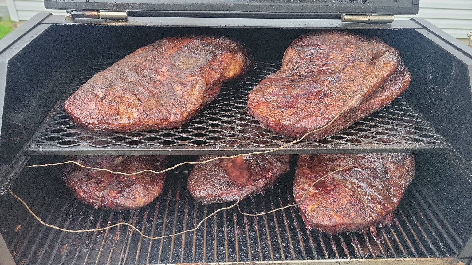 It's more of a 'feel' thing than an exact temperature. Some briskets are 'done' at 195, some not until above 200. I also tend to do a long hold prior to serving which gives you a lot more wiggle room when it comes to your actual finishing temp. These for example were finally pulled off at around 11:30, and they're now sitting in a 150 warming oven until we have to pull them out, slice them, then serve for dinner right after the race ends. I DO wrap, but I wait until a lot higher than what's considered traditional. I usually wait until they're up to about 180-185 in the flat, just because I like the extra exposure time to really set the bark in. Then, I pull them, wrap them in foil with a 1/4 cup of tallow, then back on until they finish in the aforementioned 195-203 range.