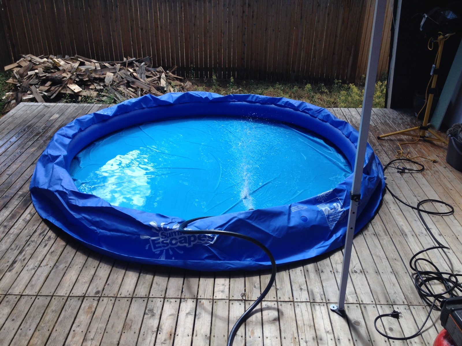 So... yeah. It's fucking hot here today, and just getting hotter all weekend. (Now calling for potentially 41°C, or about 105°F). I figured I'd grab myself some cool-loving fun and picked up a 10' above ground pool from Walmart for under $80. Quickly read the box, saw that it holds 1k litres, did the rough math... about 2.2k lbs of water. No worries. Set it up on the deck, started filling it, and went back inside to continue working from home. Went out to check on things, and it's taking a LONG time to fill... hmmm... re-read the box... oh shit. 1k gallons of water, or about 4k litres, or about 9k lbs of water. Now I'm seriously wondering if my (albeit very well constructed) deck can withstand that kind of a load. Then I remember that the house is being foreclosed on, and figure the worst that can happen is that I end up building half a deck. So yeah... here goes nothing.