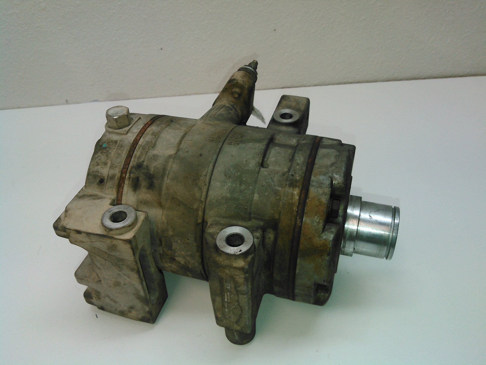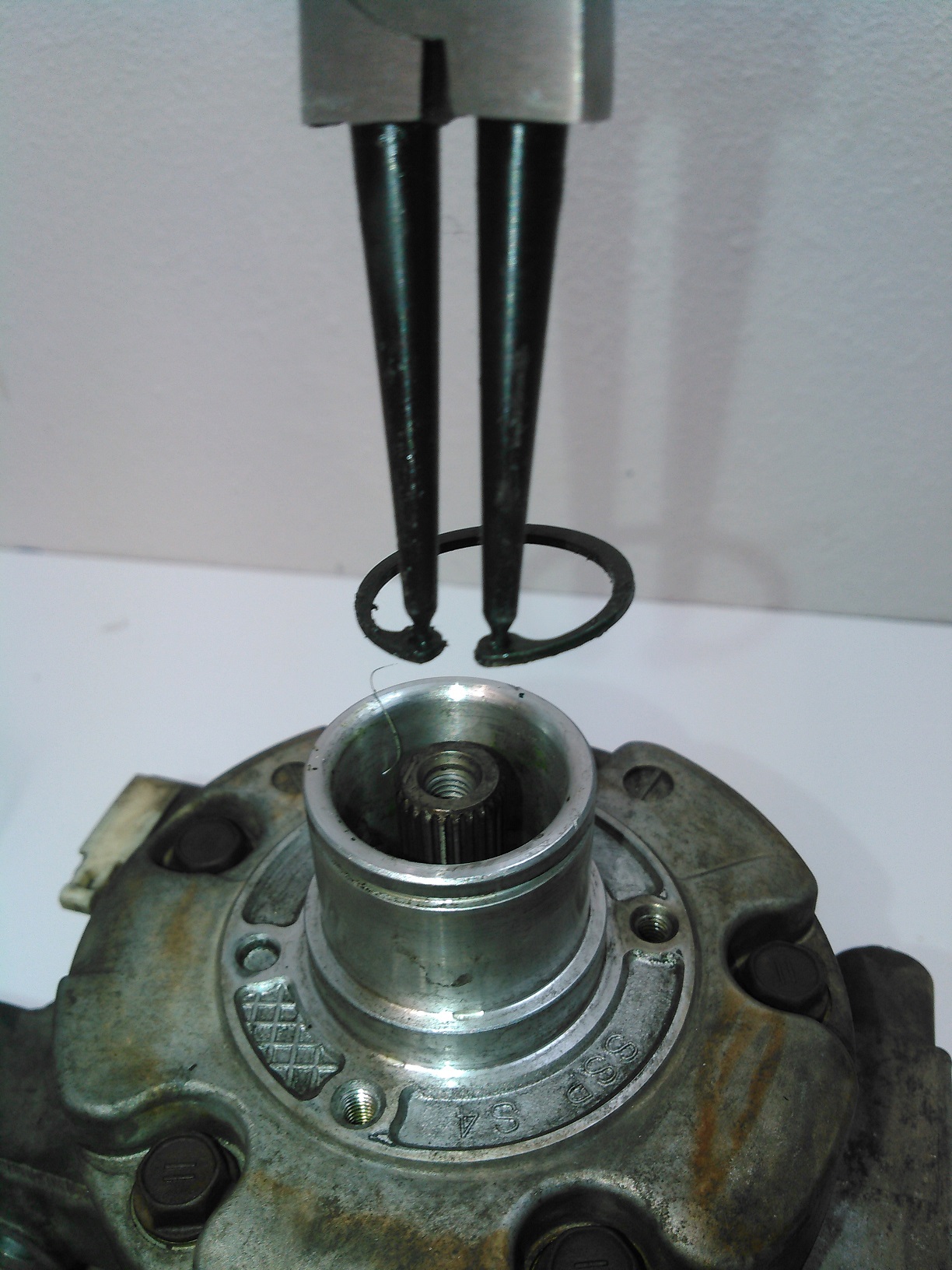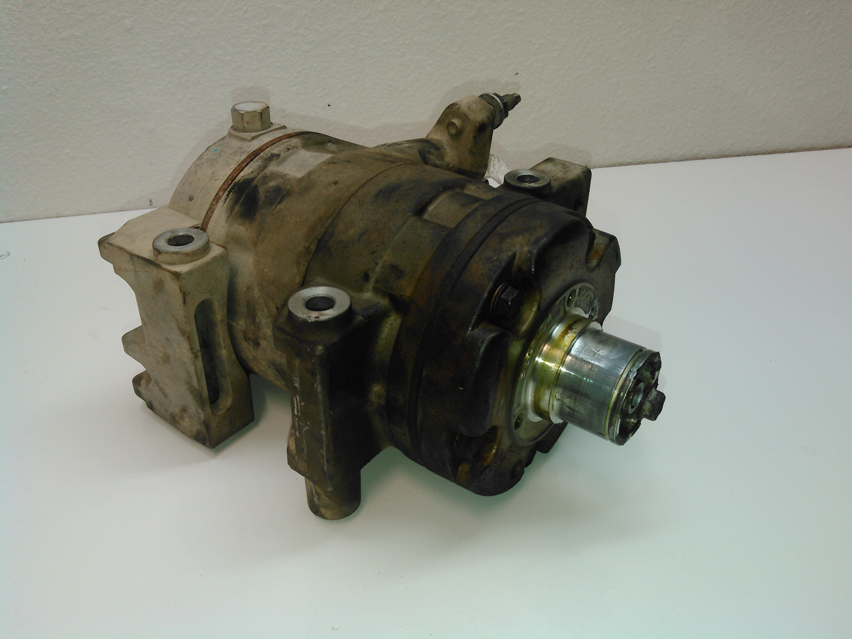 Here's the compressor, cleaned up: Spoiler It might not look like that much of a difference, but it makes a world of difference when you're working on it. Spoiler Now that (most of) the greasy shit is out of the way, you can see the snap ring that holds the input shaft seal in place. You could theoretically replace the seal from this point, but realistically, it's very unlikely that you'd get it installed properly, which would mean doing this job twice. So you have to remove the front housing. Spoiler Here's the outer housing removed. This thing WILL NOT come off easily. It requires tapping upward on the housing while pulling upwards, because the compressor uses spring-loaded dowel pins, which I will show in the next picture. DO NOT try to pry between the two housing halves. The gasket is laminated steel, and is reusable, unless it's really screwed up.This one looks just fine, so I'm putting it back into service. Spoiler Here, you can see the pain-in-the-ass dowel pins, which are a necessary evil. While we're at this point, pay attention to the sealing surfaces of the input shaft. Clean them off, and if there is any sort of groove in it, it's junk. This one is good to go. Spoiler Here's the inside view of the old seal. An important thing to mention here is that the inside of the case is very clean. If you see any metal shavings inside here, stop immediately and get a new compressor, replace your condenser, and flush out all of your refrigerant lines. You've got bigger problems. Spoiler Here's how you remove the snap ring for the input shaft seal. It is neither rocket science or brain surgery, but you need long-reach snap-ring pliers to get it out.
