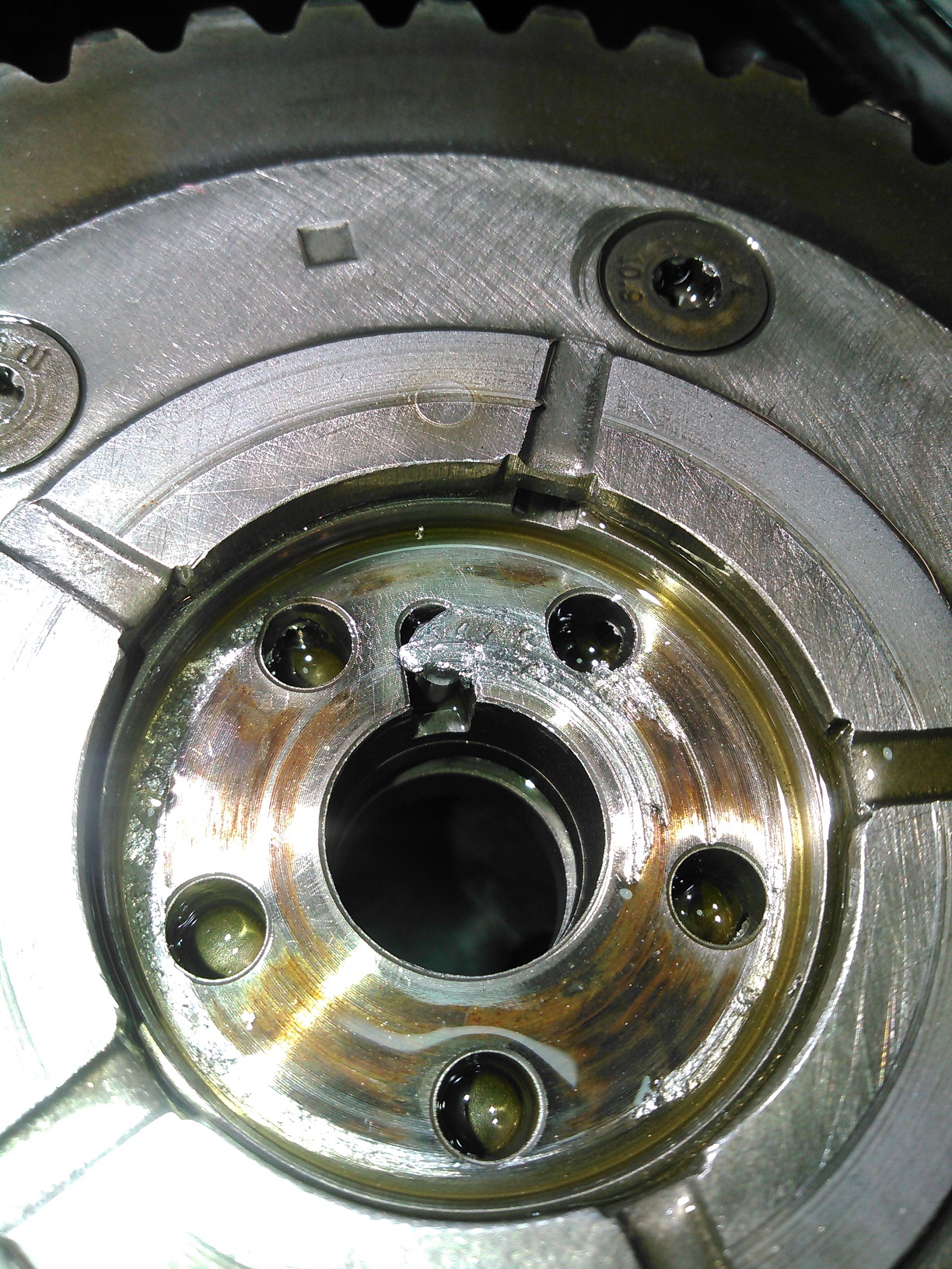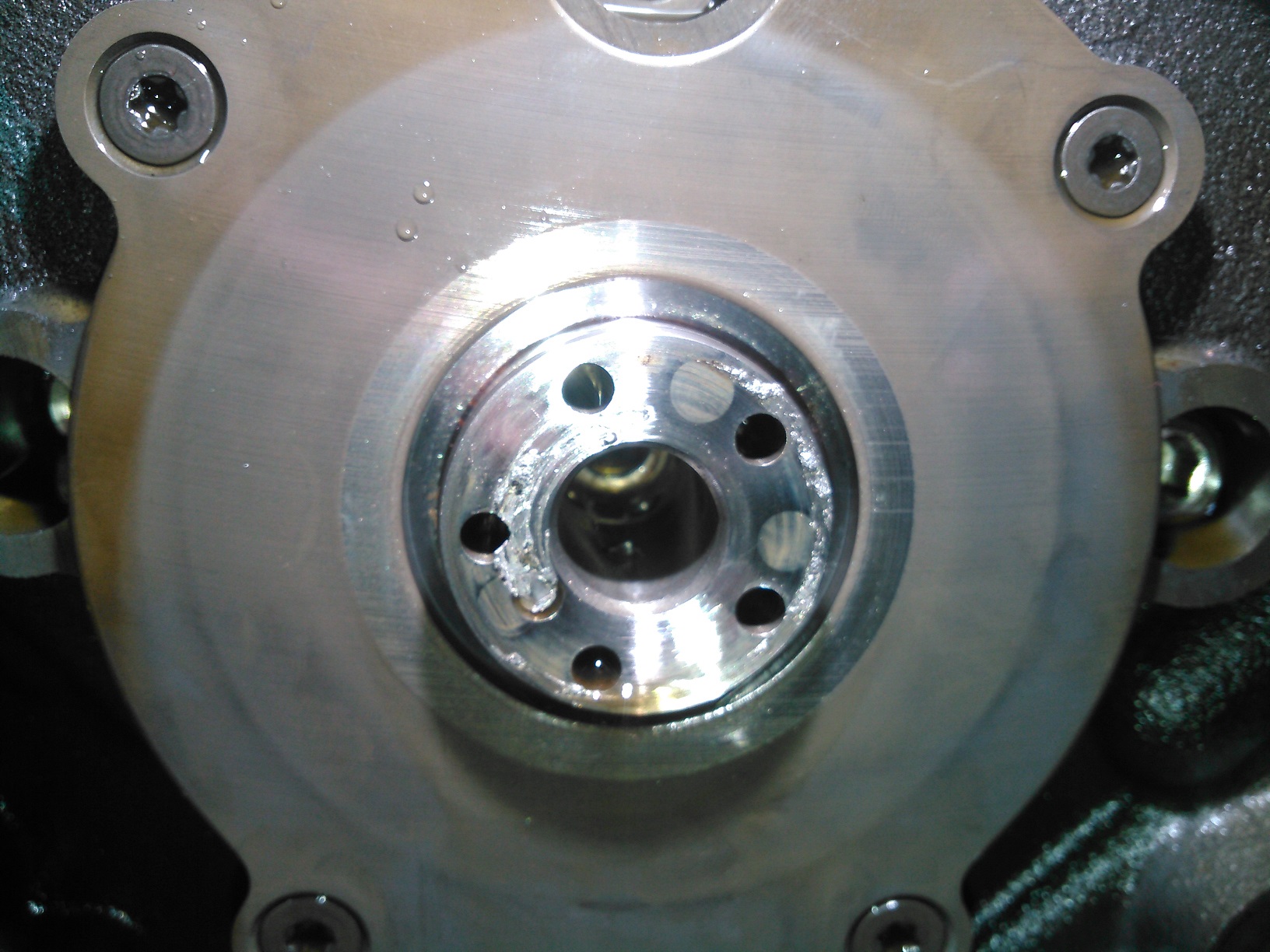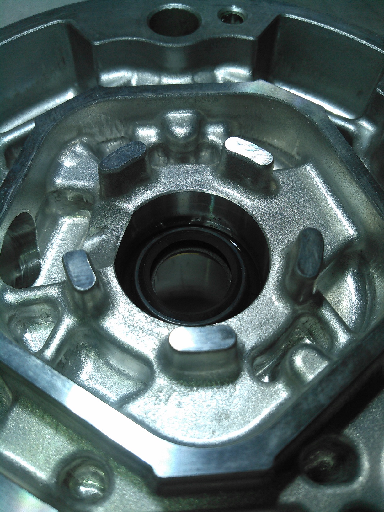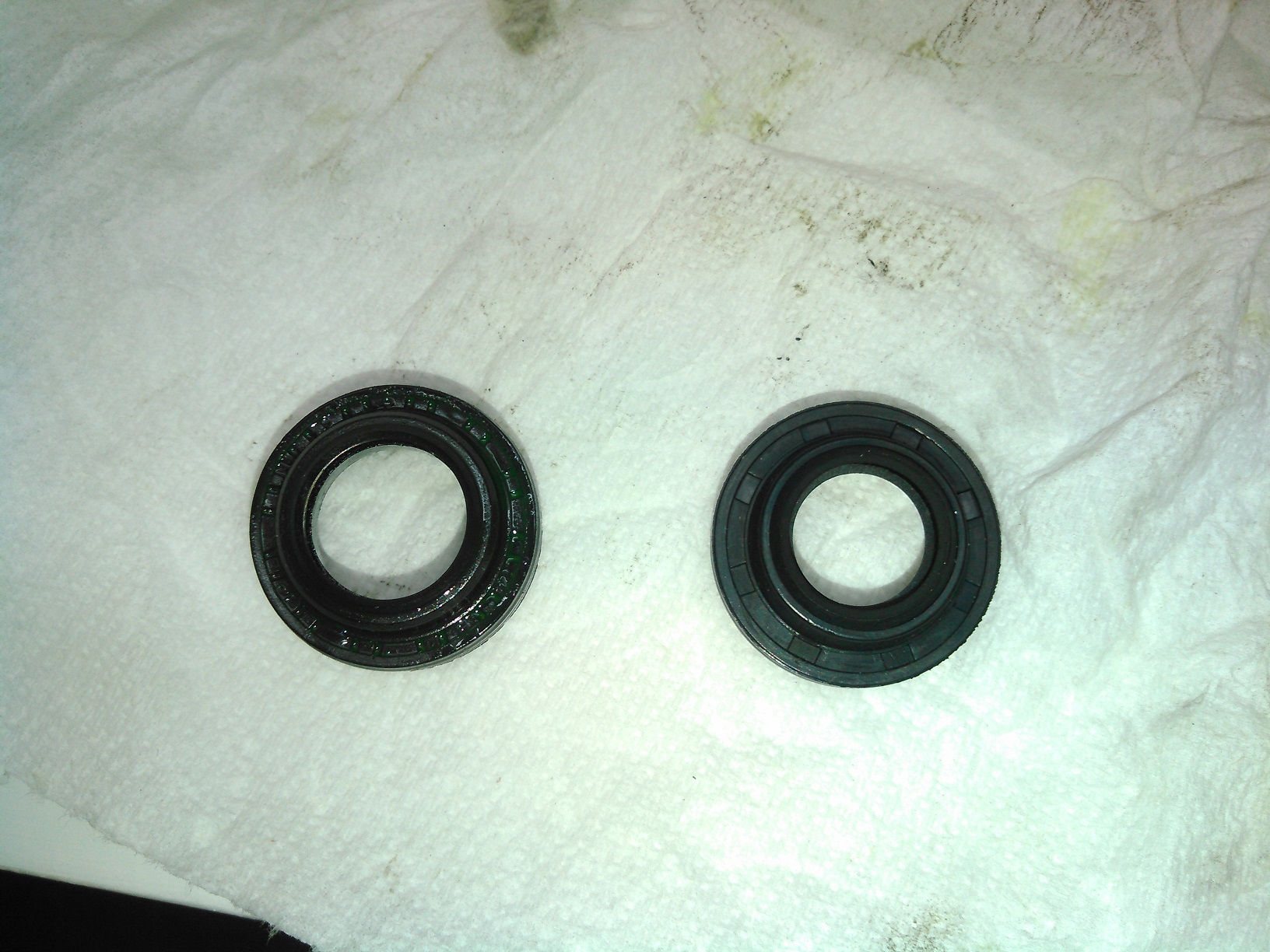 Here's the compressor, cleaned up: Spoiler It might not look like that much of a difference, but it makes a world of difference when you're working on it. Spoiler Now that (most of) the greasy shit is out of the way, you can see the snap ring that holds the input shaft seal in place. You could theoretically replace the seal from this point, but realistically, it's very unlikely that you'd get it installed properly, which would mean doing this job twice. So you have to remove the front housing. Spoiler Here's the outer housing removed. This thing WILL NOT come off easily. It requires tapping upward on the housing while pulling upwards, because the compressor uses spring-loaded dowel pins, which I will show in the next picture. DO NOT try to pry between the two housing halves. The gasket is laminated steel, and is reusable, unless it's really screwed up.This one looks just fine, so I'm putting it back into service. Spoiler Here, you can see the pain-in-the-ass dowel pins, which are a necessary evil. While we're at this point, pay attention to the sealing surfaces of the input shaft. Clean them off, and if there is any sort of groove in it, it's junk. This one is good to go. Spoiler Here's the inside view of the old seal. An important thing to mention here is that the inside of the case is very clean. If you see any metal shavings inside here, stop immediately and get a new compressor, replace your condenser, and flush out all of your refrigerant lines. You've got bigger problems. Spoiler Here's how you remove the snap ring for the input shaft seal. It is neither rocket science or brain surgery, but you need long-reach snap-ring pliers to get it out.