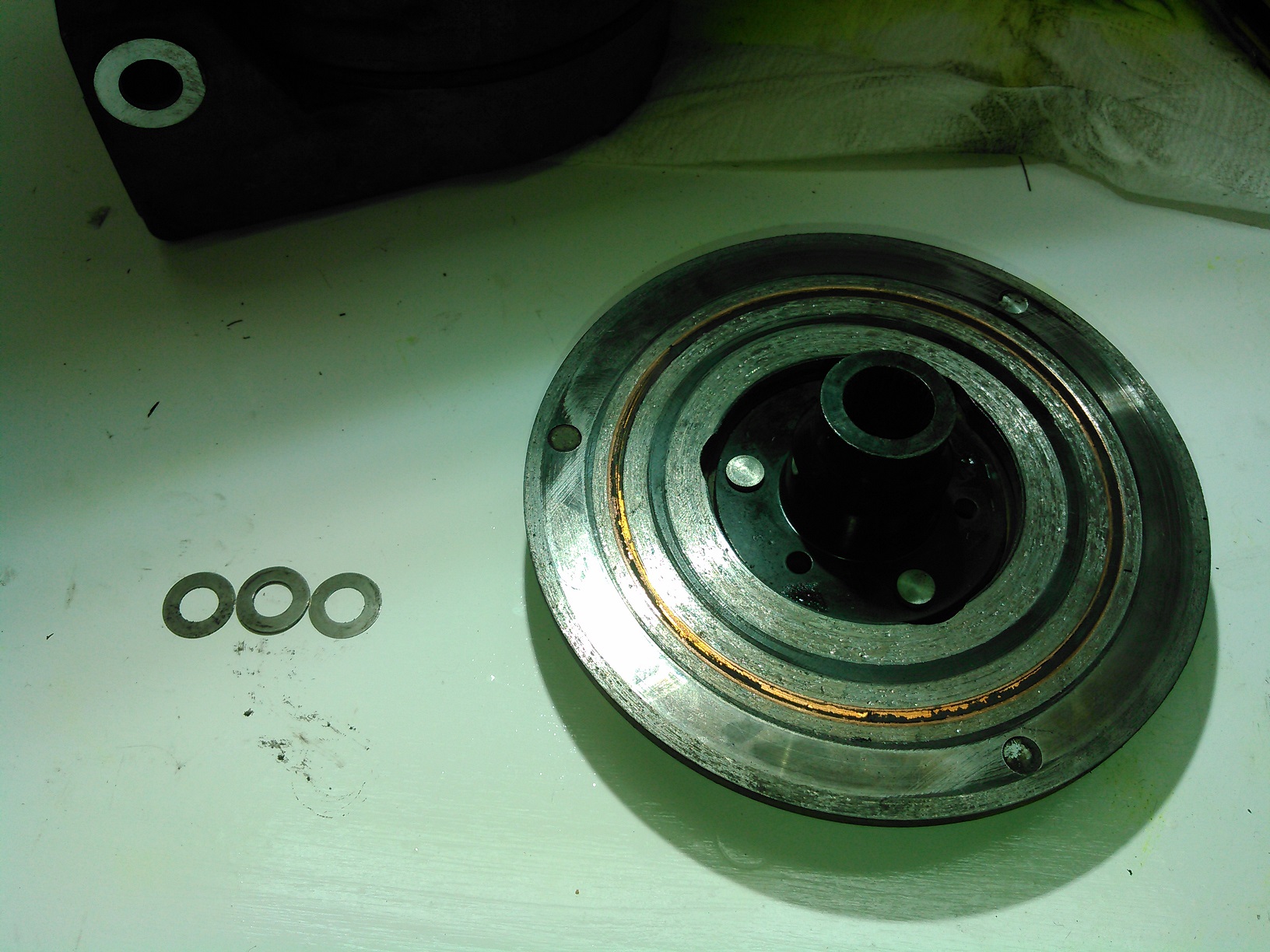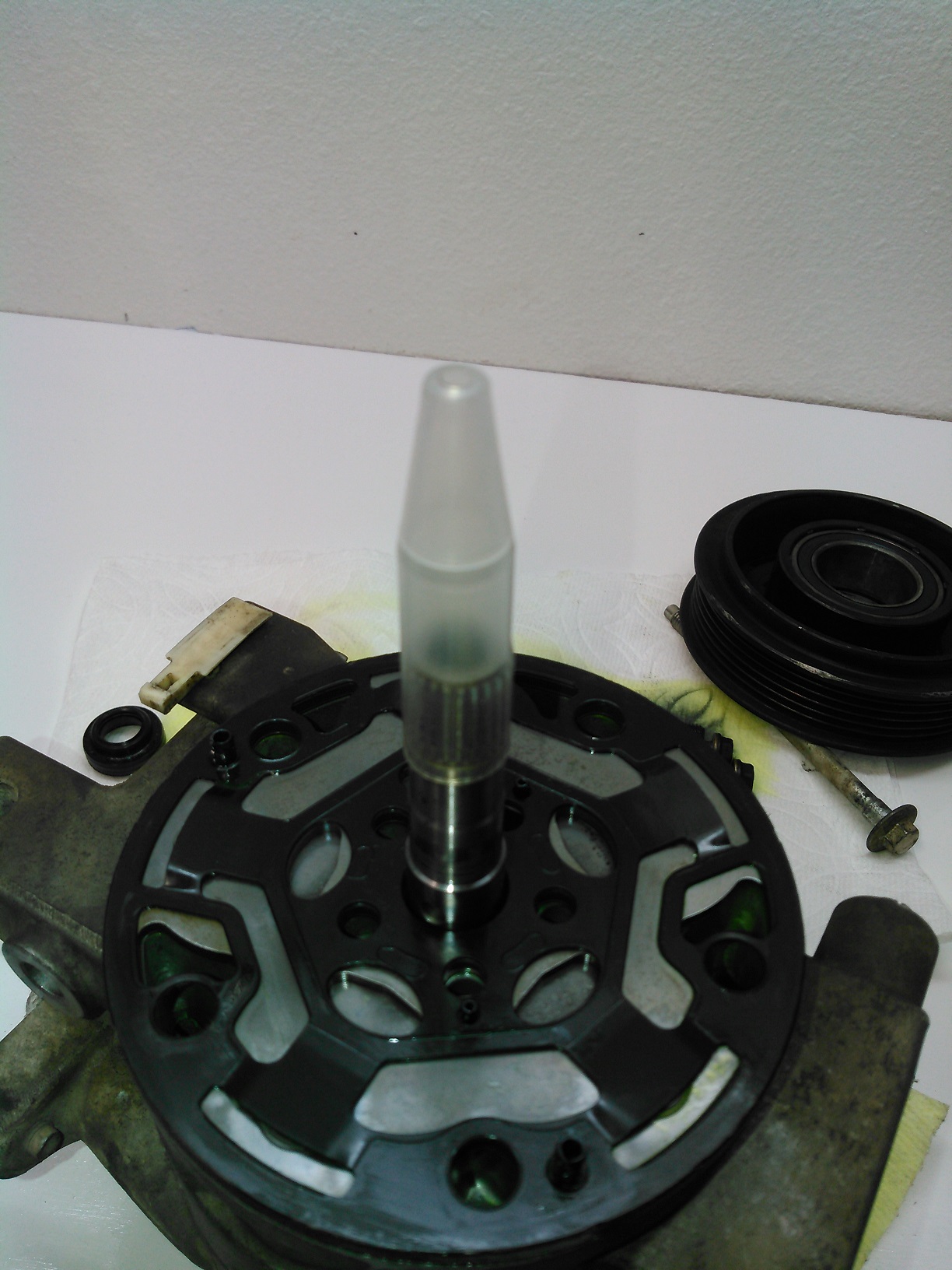 Now we're in the home-stretch: Spoiler Here's the old seal next to the new seal. This is the inside view, for the record. New seal installed. Spoiler Spoiler This is the seal installation "tool." It keeps the new, unforgiving Teflon seal from getting scratched upon installation. You install the new seal into the outer housing, install the snap-ring, lube the input shaft with refrigerant oil, and slowly slide it down over this cone. There will be some resistance, but just go slow and steady, and you should be fine. Spoiler Remember those shims I told you about a couple of posts ago? This is where they go. I put a little bit of oil on them to make them stick inside the clutch housing. Now you plop that onto the input shaft splines, bolt it on, and go.* *after vacuuming and recharging the system, of course. DONE. But open to questions.