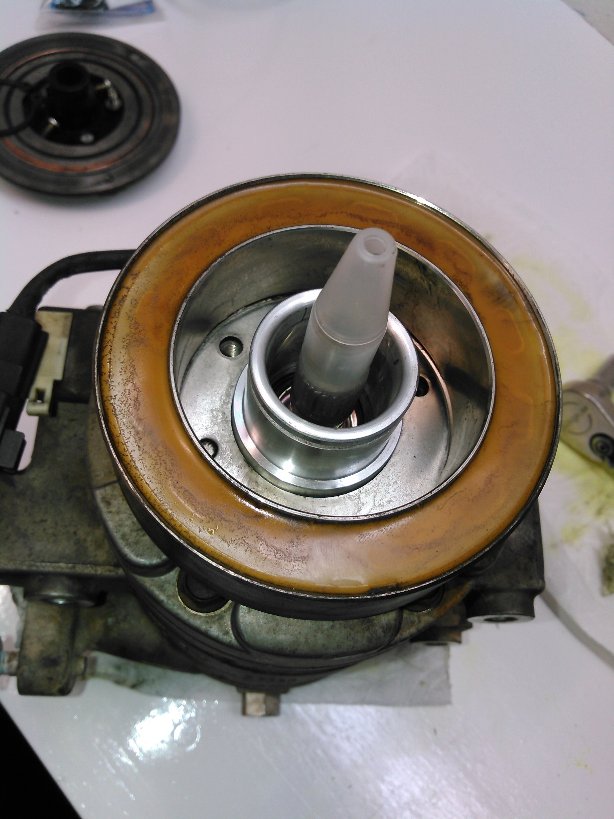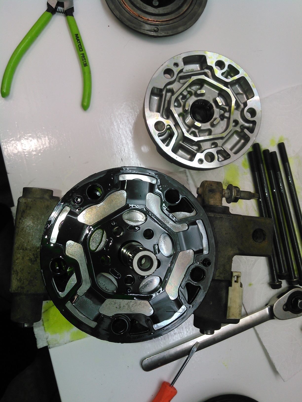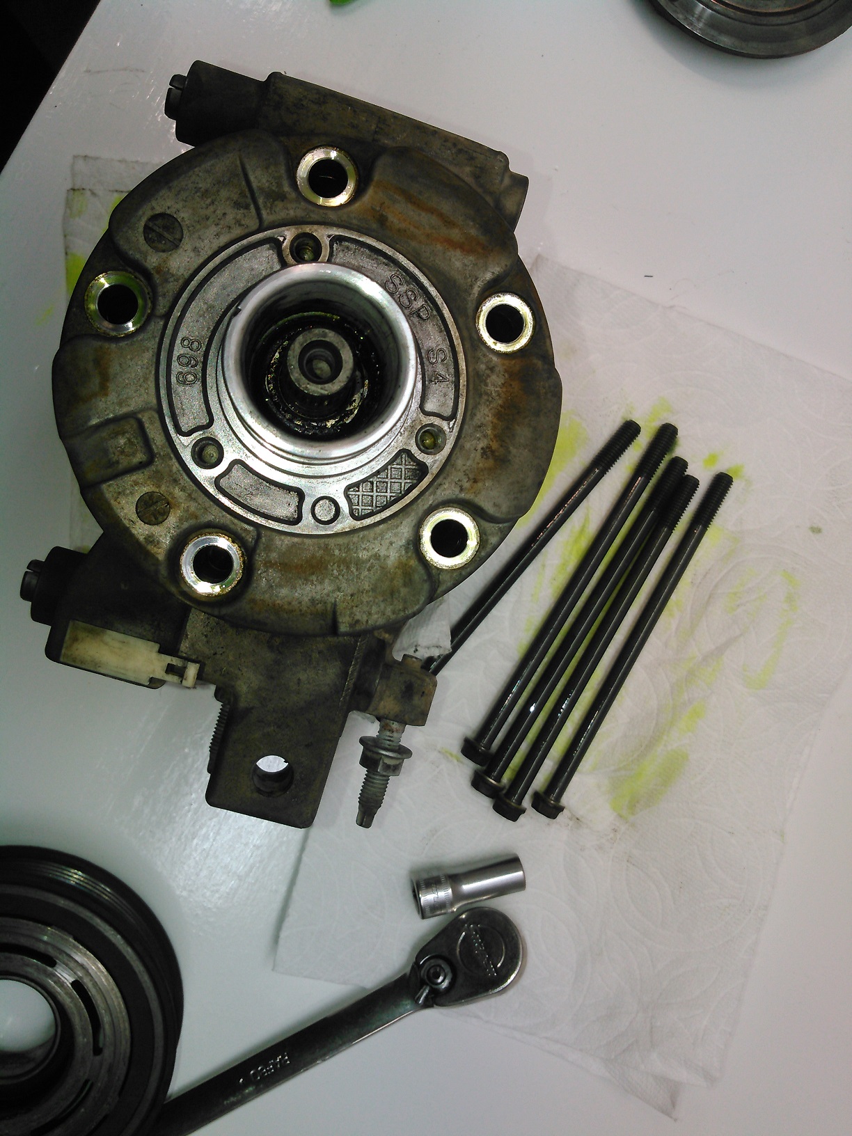Oh shit! My truck's A/C compressor started leaking! What am I going to do?! I guess I'll have to buy a new/ reman compressor, right? I've got two words for you: 1) FUCK, 2) THAT. I resealed that bitch. Here's how I did it. (I had already started stripping down the compressor before I got the idea of chronicling this, so some of the pictures don't necessarily match up. Got a problem with that? Take it up with my butt, he's the only one who gives a crap.) Spoiler This is the outer part of the A/C clutch removed. You can open the hood of your car to see what it looks like installed. It's held on with one 10mm bolt, and it has shims under it. THESE ARE VERY IMPORTANT, DO NOT LOSE THEM! If you omit these, you could end up with a compressor that will never turn off. Clean them up, and set them aside for later. Spoiler Once you remove the outer part of the clutch, you will be greeted with the inner part, which is retained with a snap ring (shown here already removed). The inner clutch will usually be a minor press-fit, and require a little bit of persuasion/ tapping to be removed. Spoiler Once that is out of the way, the next thing is the field-coil, the electromagnet that clamps the two clutch-halves together. You could technically leave this in place to do this job, but I removed it anyway to clean it. The plastic cone you see is the installation tool to keep from tearing the new seal. This picture was taken AFTER everything was assembled. You do not put it on before. Spoiler With the field coil removed, we can now see the leak point: The input shaft seal. Spoiler Here's what the compressor looks like, with the clutch assembly removed. Next step is to clean it up. More to come; don't post anything yet.