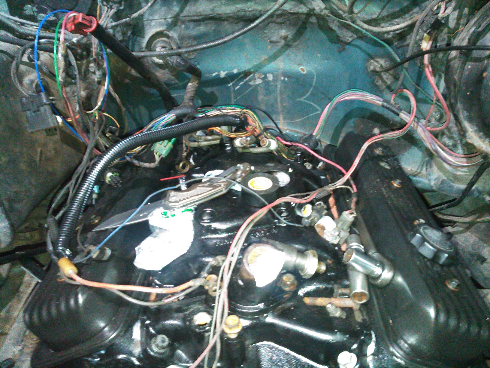Just about all of the wire-loom had cracked off (where it even had it to begin with! GM played it fast and loose with that stuff in the '80s and '90s!), and it was soaked with oil and road grime. Wires  - before.jpg