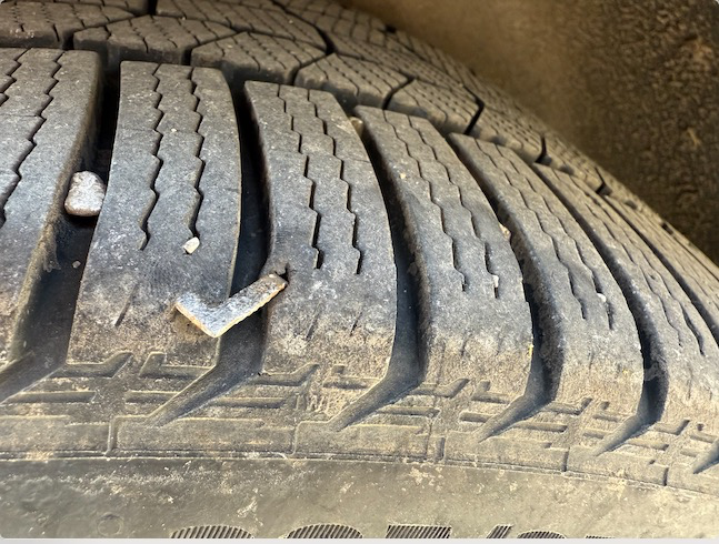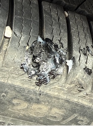 Ugh. Had a large brad nail puncture a tire. It was mostly holding air, but would drop 15 psi overnight. I'm swapping out to summer tires on Tuesday, so went to the local Kal Tire to try and get it patched/plugged, and they wouldn't do it because it's too close to the sidewall. I only needed something temp that was better than driving around with a fucking nail sticking out of the tire, but they wouldn't touch it due to liability. I get it, but still sucked. So I got a tire plug kit and just plugged it myself. What a PITA when it's freezing with a wind outside. Didn't even take the wheel off the car. It's fucking ugly, but it's no longer leaking, and I'm sure it'll last until Tuesday morning. I know, I know... looks factory, doesn't it?