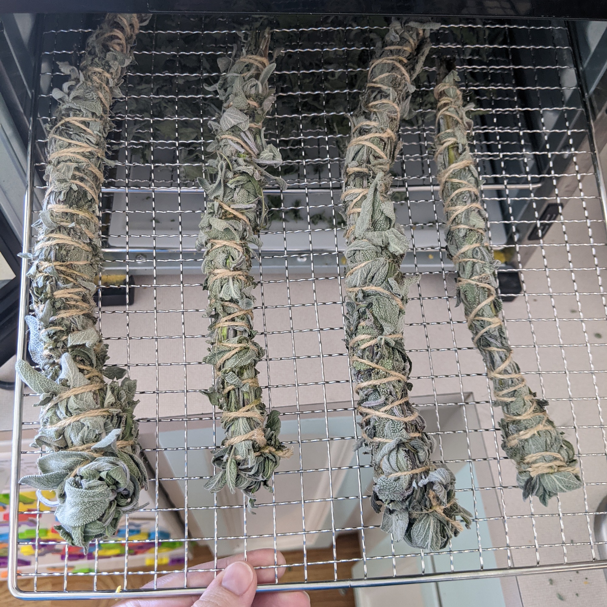 I have been mentally going through my herbs to monitize what I can for my market table. I have been drying some catnip to sell, and I've been experimenting with making smudge sticks. I think as the season goes on and the leaves fully grow out on my sage plant, my sticks will look more like the ones I see online. I also fucked up my hands. This is a gloved activity from now on.