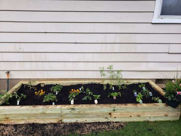 Trickysista, I think that it is outstanding that you and your family planted and are enjoying your excellent garden! They get to understand how things grow, how food happens, and you all get to enjoy each other out in the sunshine. Your tomatoes will want some support, especially the beefsteak varieties. They are basically vines that we force up with a cage or enclosure, otherwise they flop over and spread. Last year I let some black cherry tomatoes go that way, the plant was maybe 10 feet wide by the end of the season. I recently saw a video that would be easy to adapt to your bed, let me find and link it for you. If your pepper plants get too heavy with peppers, or if it is windy there, they might need a large stake or two for support. I never use all the herbs either, I just enjoy them while they last!