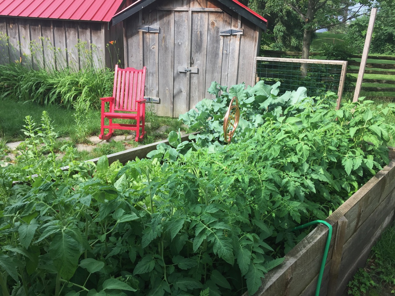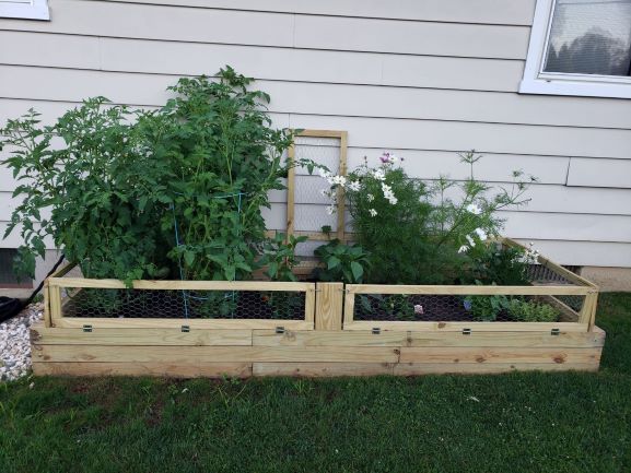 This is the first year I have a garden. I started it around mother's day and take a look at it now!! I had no idea the tomato plants would get so tall!! Behind the left gate, there are two sweet 100s plants on the right, one striped dragon tomato plant on the front left, and a beefsteak tomato plant behind that. The beefsteak plant has one tomato that's been green for a long time, and the plant itself is smaller than the rest. I think it's because the other three are blocking all the sunlight, so we'll see how that little guy will end up. I also have a corinto cucumber plant that produced one cuke already, and then died when it got pelted by hail. At least I thought it died. It's growing again and attaching itself to the trellis, which is just really cool to watch. A few buds are turning into cukes at this point too! In front of the cucumber, I have one banana pepper plant, and one bell pepper plant. I've gotten two banana peppers so far, both of which were kind of dry because I think I left them on too long. There's one green bell pepper on the plant that's been the same size for a while now, and I thought it was supposed to turn orange, so I don't know what's going on with that. The strawberries are coming in strong, and then I have some herbs...more than I know what to do with! I would hate to see any of this go to waste so what do you do with so many herbs? Am I just going to be making pesto for days?? Overall, I'm loving watching everything grow. Any suggestions, tips or tricks would be appreciated! My kids are really excited about it too, so next year I might start a mini garden for them.
