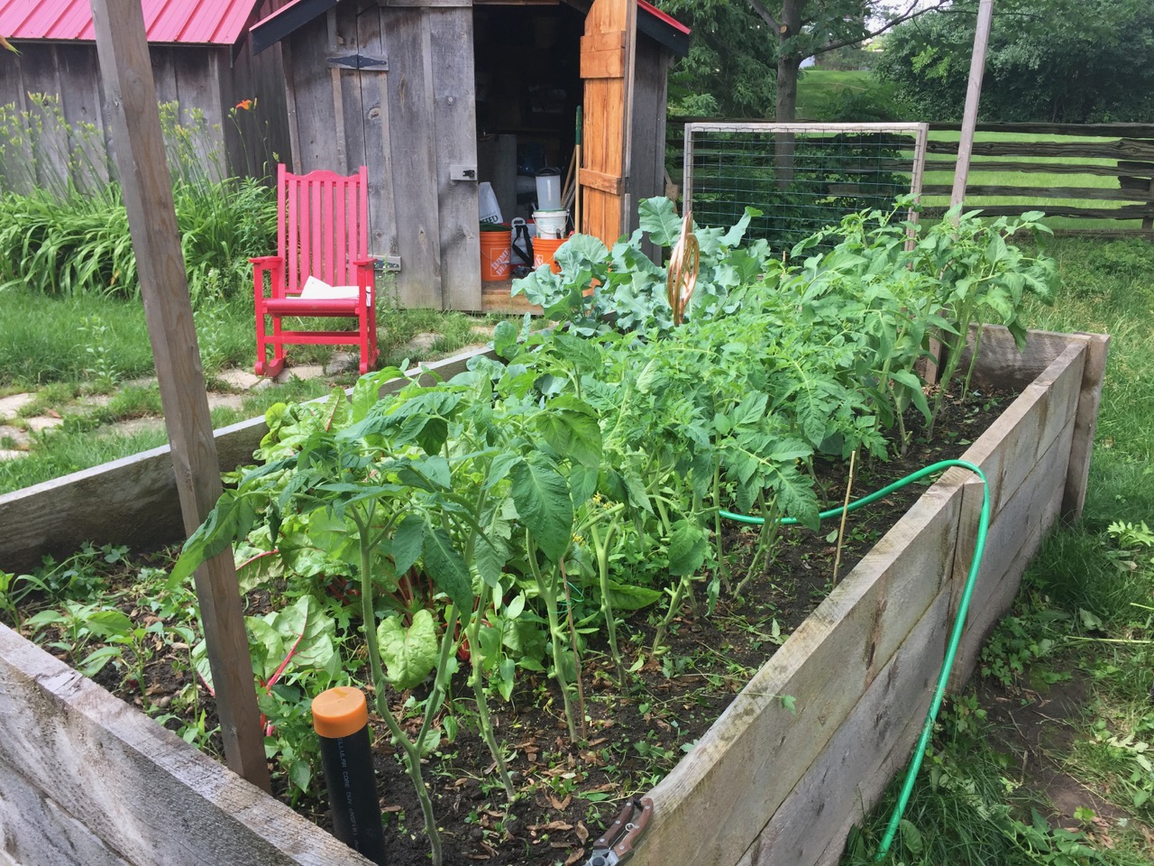 Just went through and suckered the tomatoes... it should be interesting. I learned this year that you should try and bury tomato plants as deep as you can, because all the little hairs on the stalk of a "baby" tomato plant can grow to be roots underground. The plant pro at the local greenhouse told me a common fault is people planting them too early, and not deep enough... let the seedlings grow as much as you can, then bury them as deep as you can. I did that, and holy shit those stalks are now like bushes... very thick, very strong. Never mind all of that growth in the previous pics happened in TWO WEEKS. I trimmed everything way back with the expectation that everything else will kick into high gear. All that is left is to get the supports up over the next few days. I have a hanging vine setup I want to make which will take a bit of work in the shop, but should do nicely I think. Before: After: